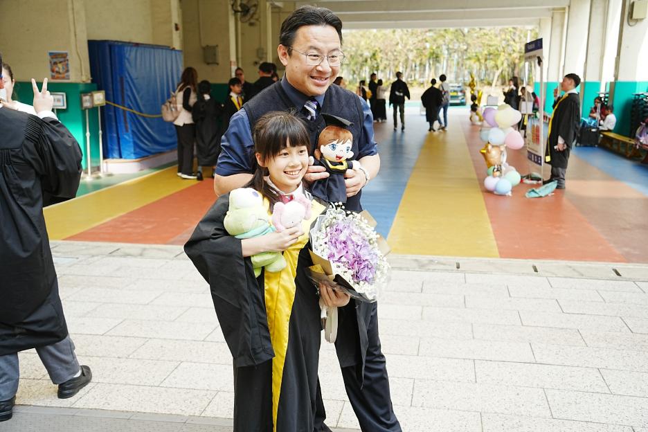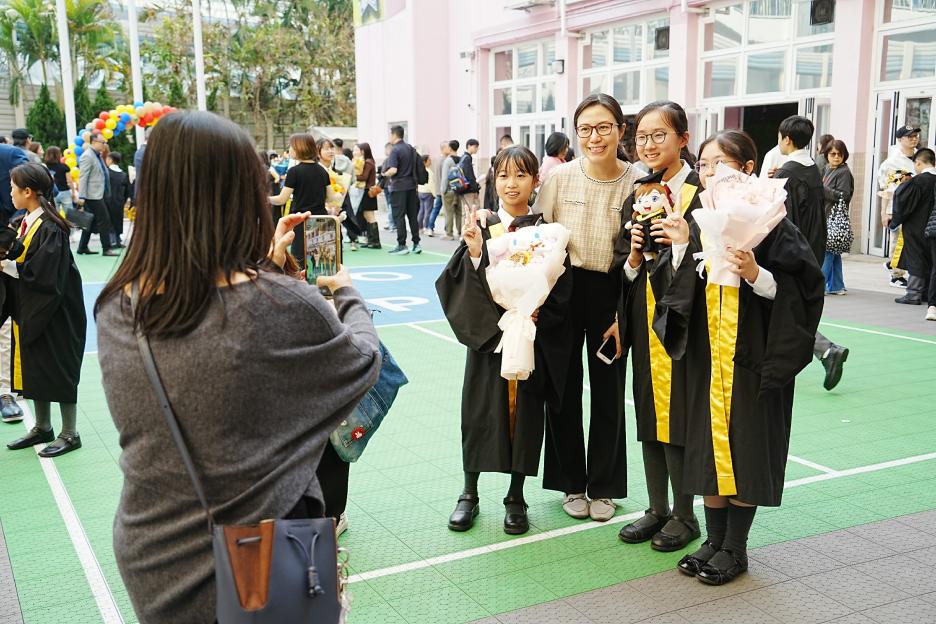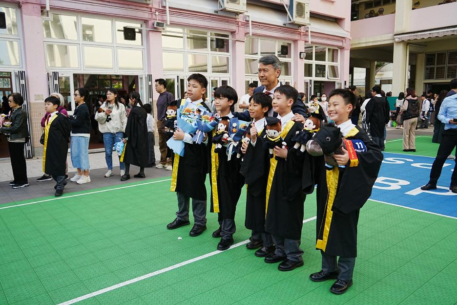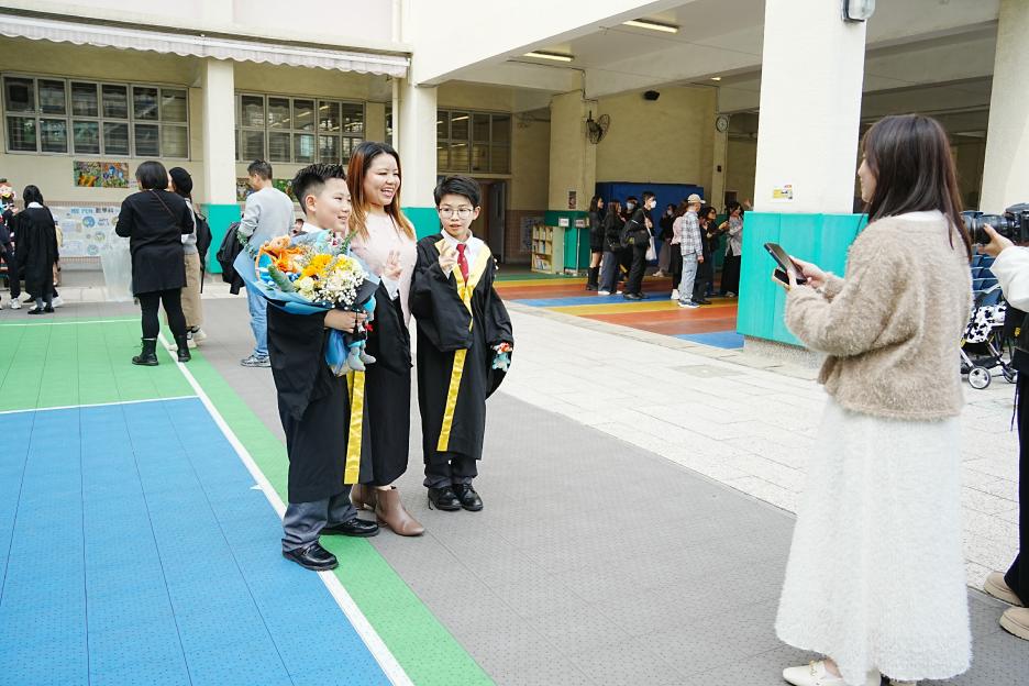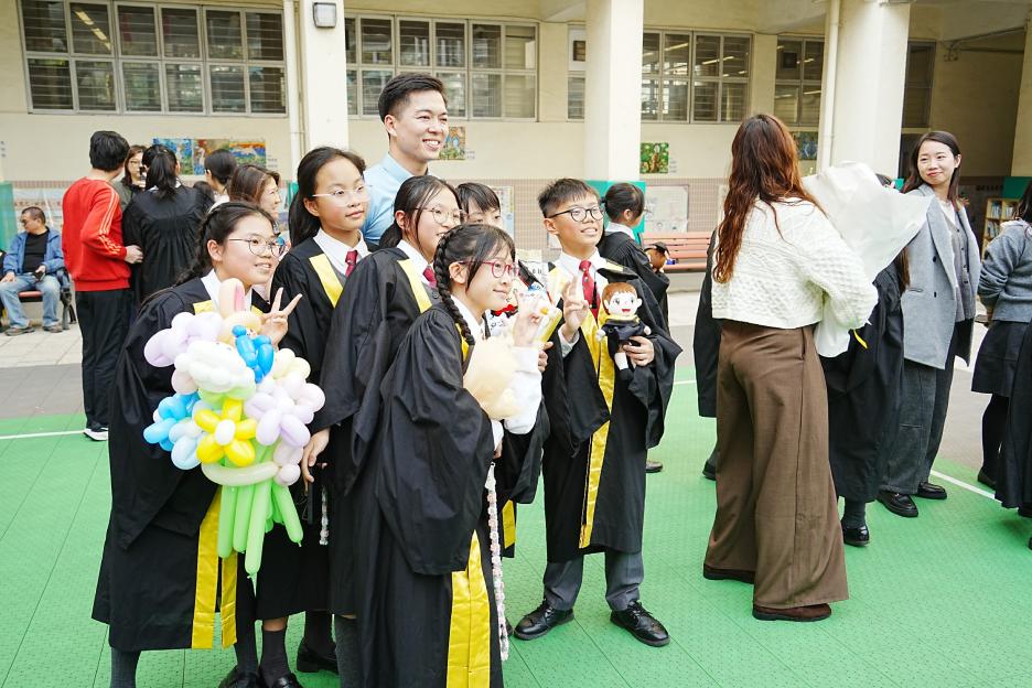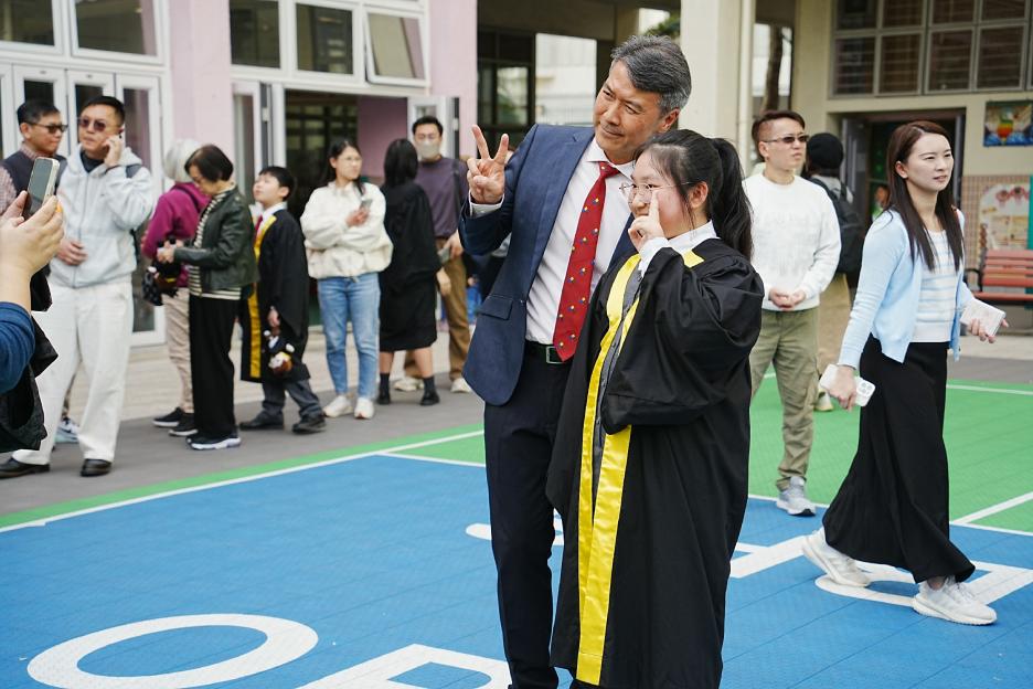 2月11日,陽光明媚,六年級同學穿上畢業袍,在校園各個角落與老師拍照留念,笑臉滿載、氣氛熱烈。 校長老師更成為「人氣王」,同學與家長們紛紛排隊合照!