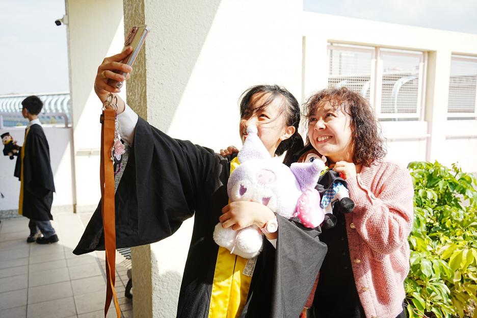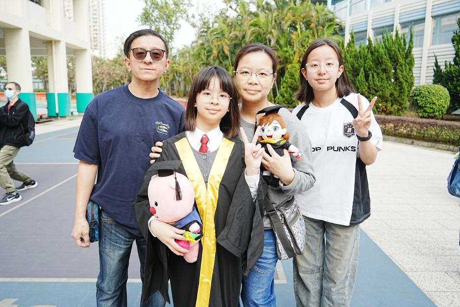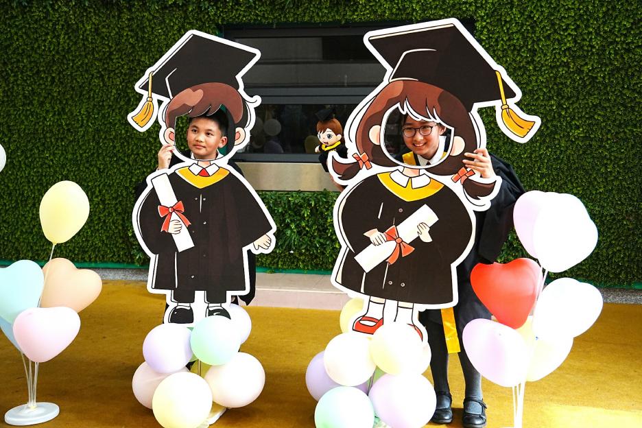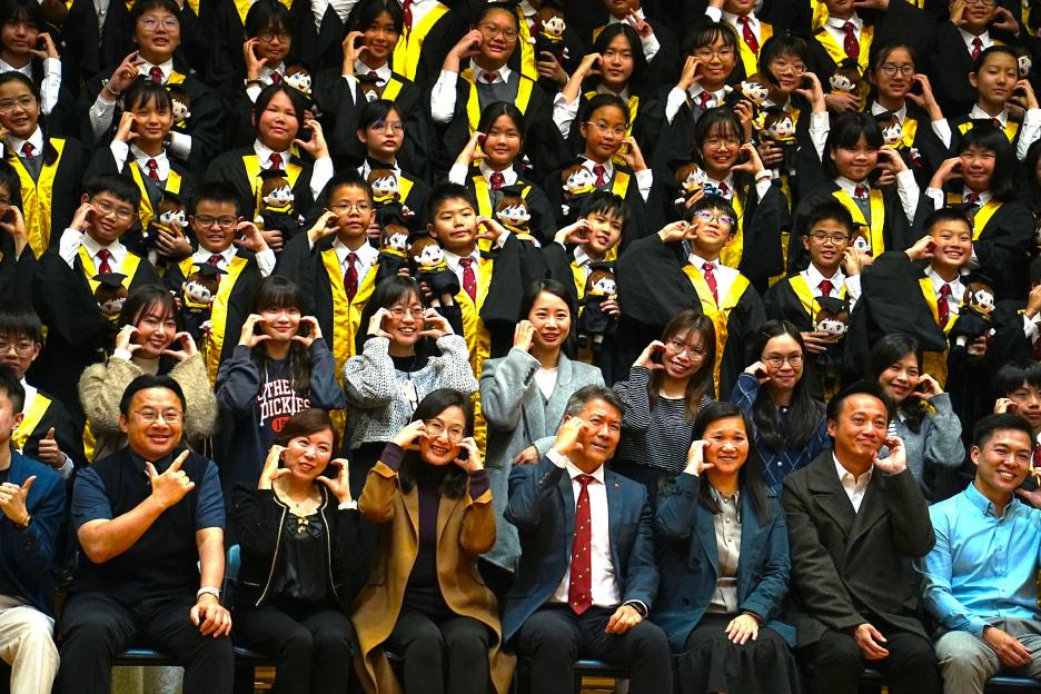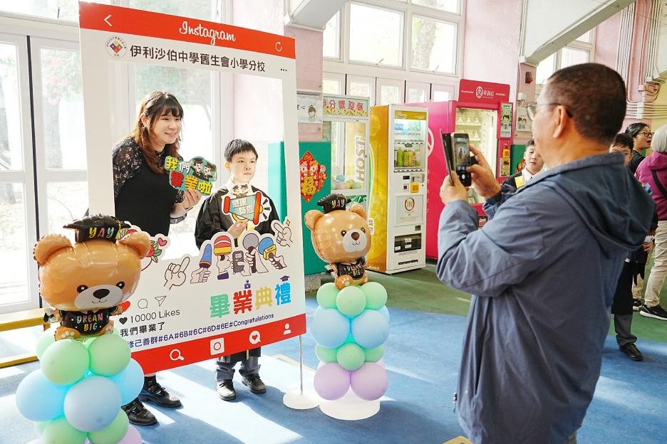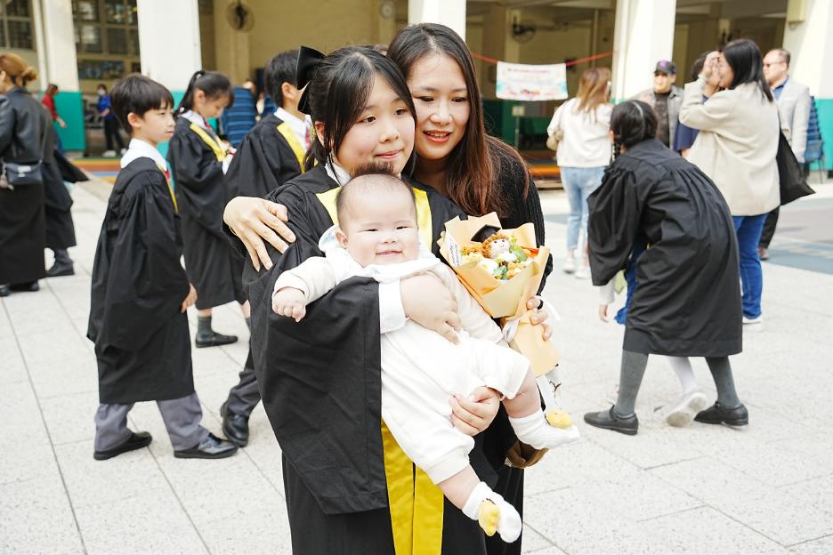 2月11日,陽光明媚,六年級同學穿上畢業袍,在校園各個角落與老師拍照留念,笑臉滿載、氣氛熱烈。 校長老師更成為「人氣王」,同學與家長們紛紛排隊合照!