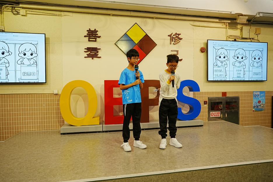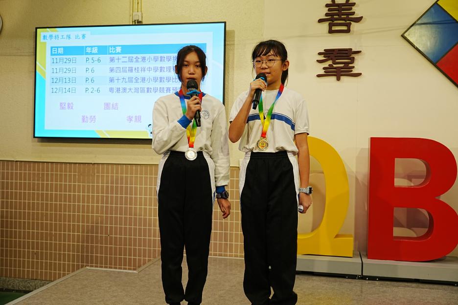 今天是普通話早會。首先,我校六年級數學特工隊一共十二位同學在11月15日參加由伯特利中學舉辦的第十七屆數學多元挑戰賽,我們在團體比賽中,一共奪得一個一等獎和兩個二等獎。接著,領袖生總隊長表揚及提醒全校同學最近的行為表現。別忘了,2025立法會換屆選舉將於12月7日(日)進行投票,本校《憲法》和《基本法》 學生校園大使於早會鼓勵各位同學積極參與相關的填色比賽,並回家呼籲家長於當天踴躍投票。最後,是「Marty 比賽投票」宣傳。