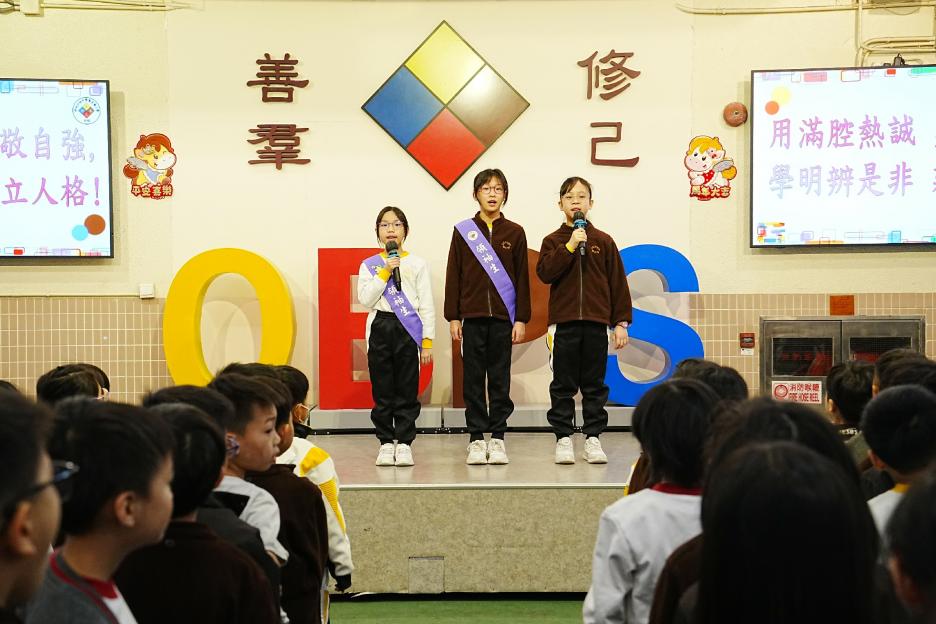 今天是普通話早會。首先進行每月之星的頒獎,這個月的主題是承擔精神,獲獎學生不但能盡力做好本份,更積極思考如何精益求精,值得讚賞。接下來是匹克球比賽及校運會頒獎,恭喜各位運動健兒!最後是中華文化日的宣傳。