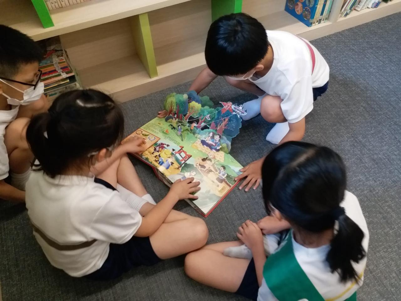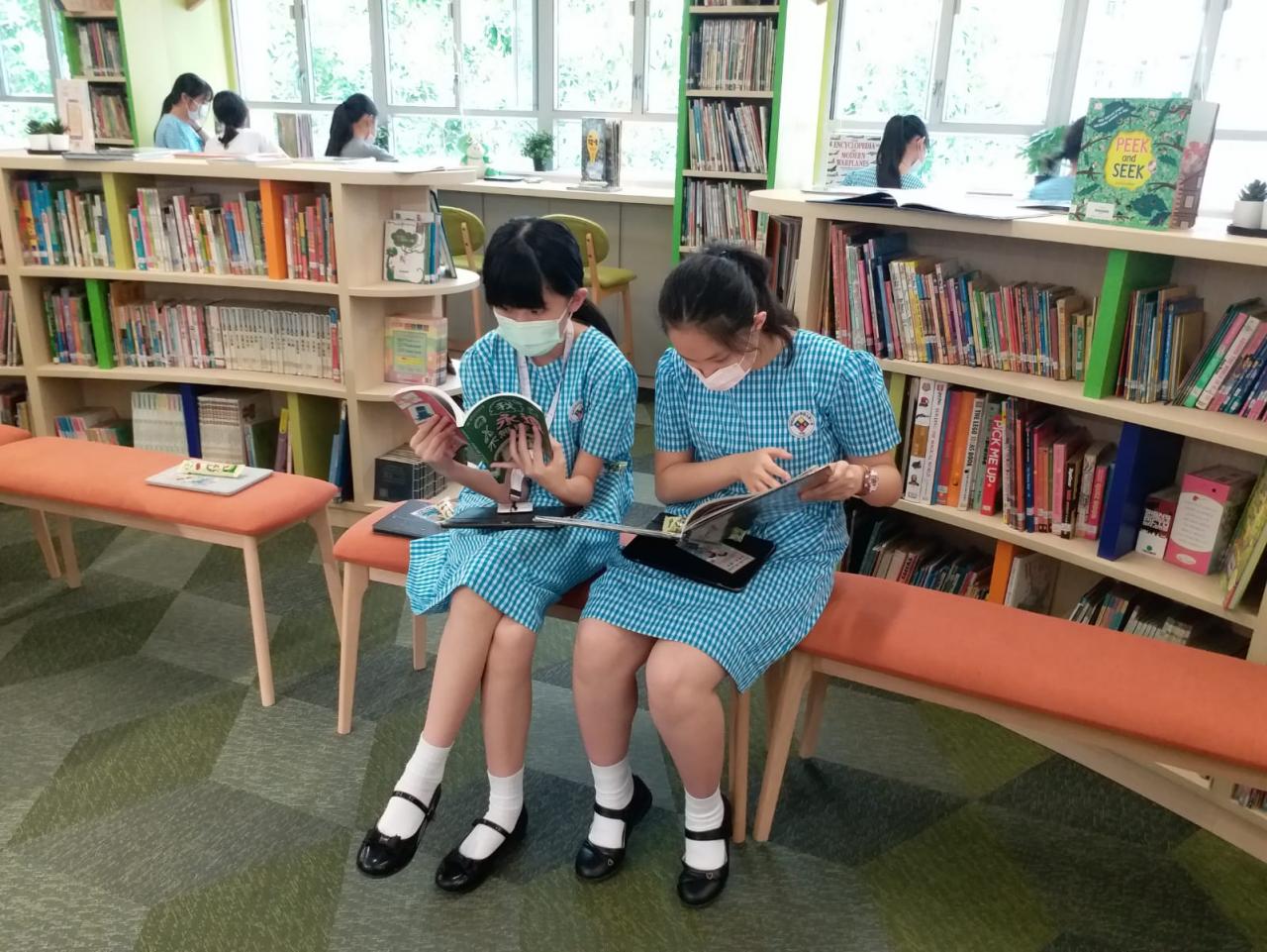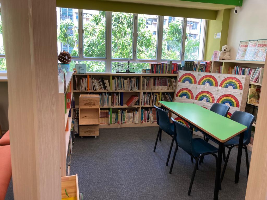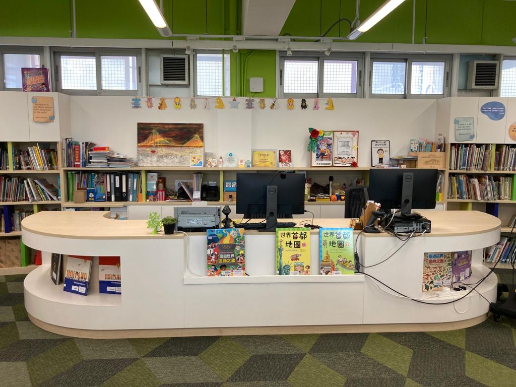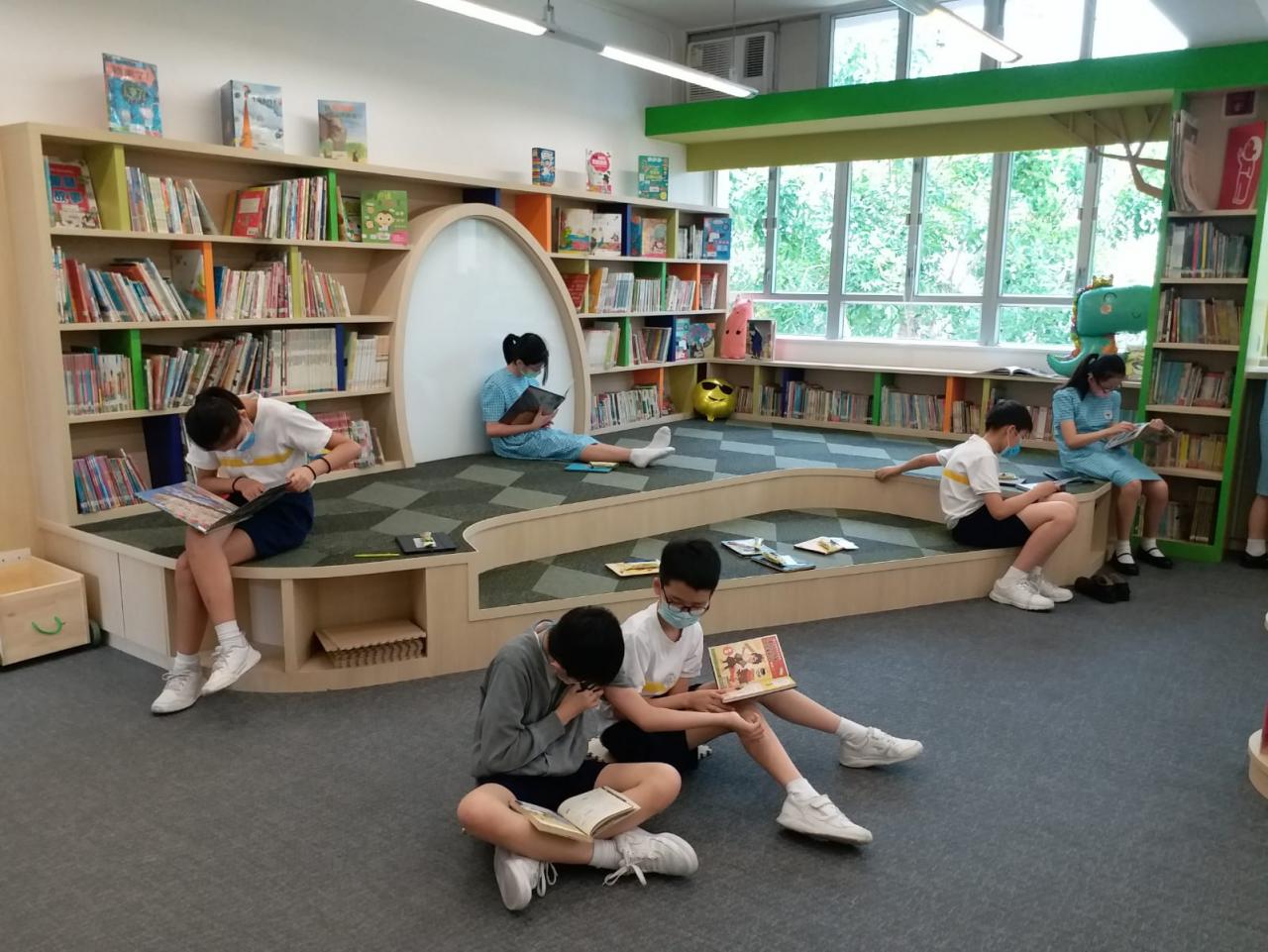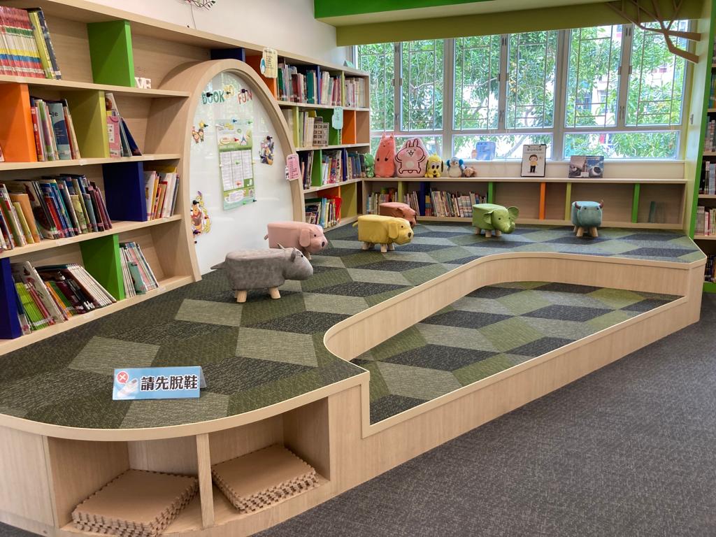 本校圖書館設於三樓,設計以森林為主題,營造恬靜舒適的感覺,加設木地台讓學生輕鬆自在地閱讀,另加建會議角讓學生進行小組討論。