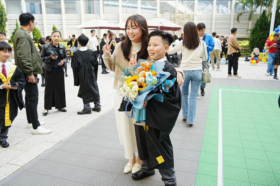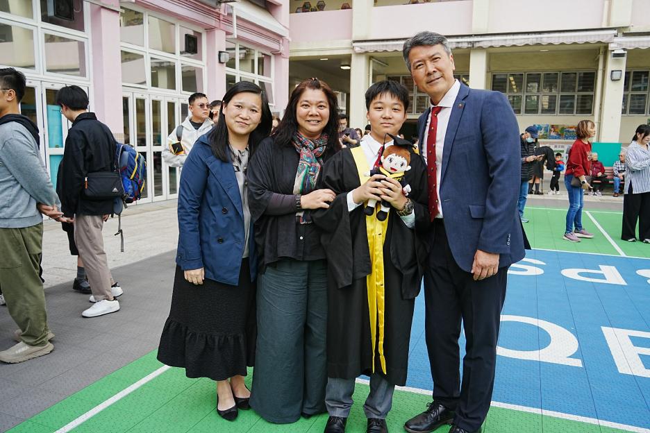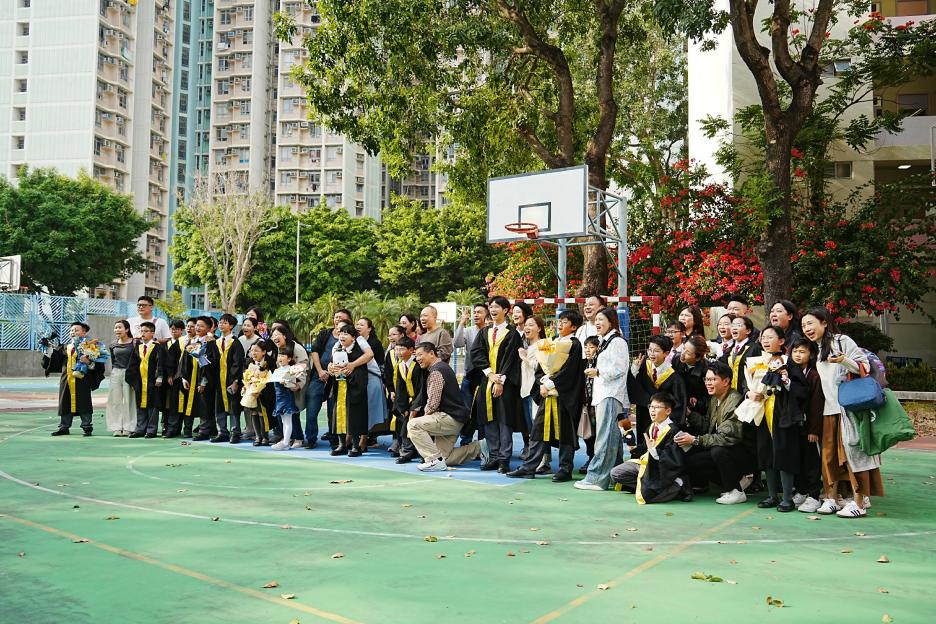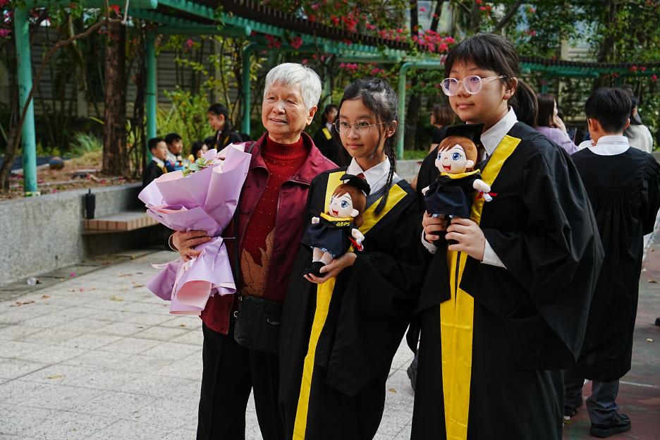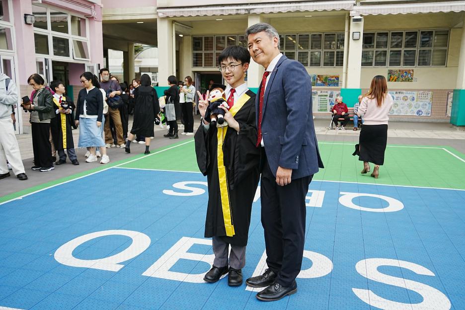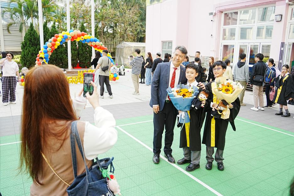 2月11日,陽光明媚,六年級同學穿上畢業袍,在校園各個角落與老師拍照留念,笑臉滿載、氣氛熱烈。 校長老師更成為「人氣王」,同學與家長們紛紛排隊合照!