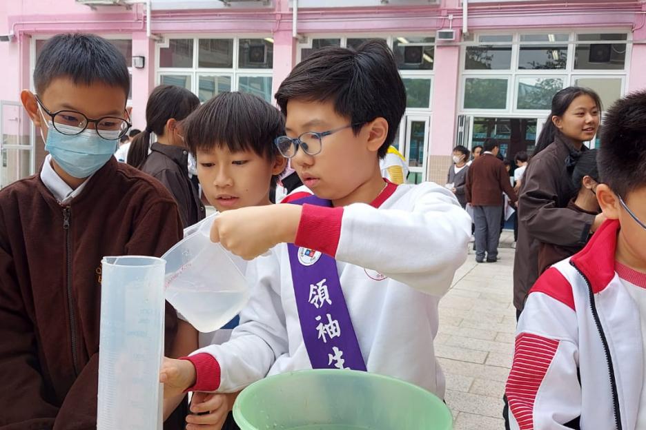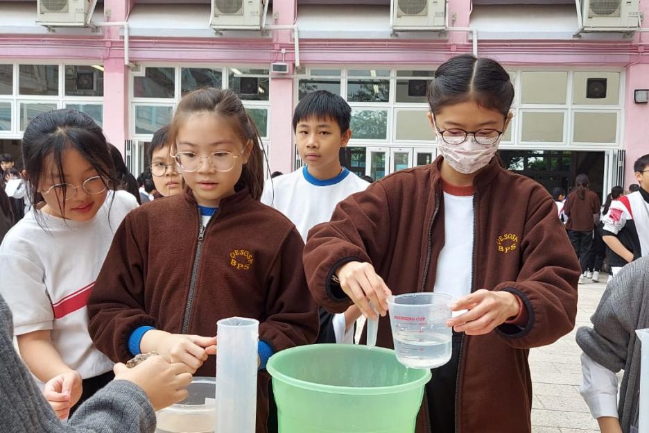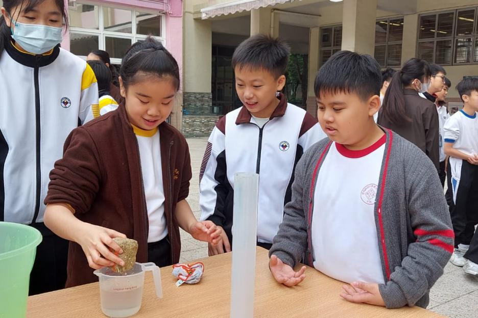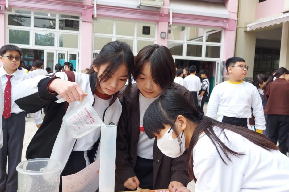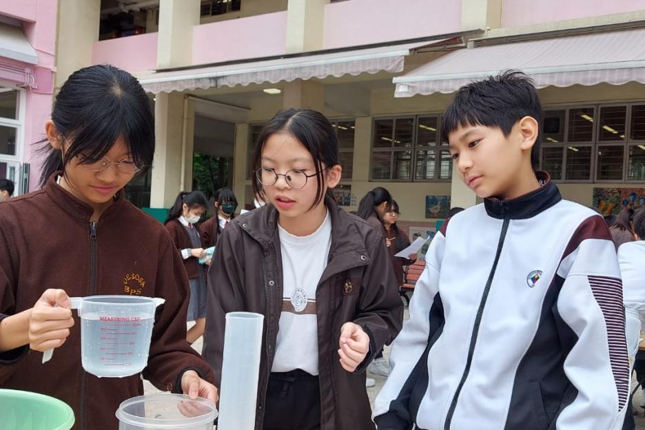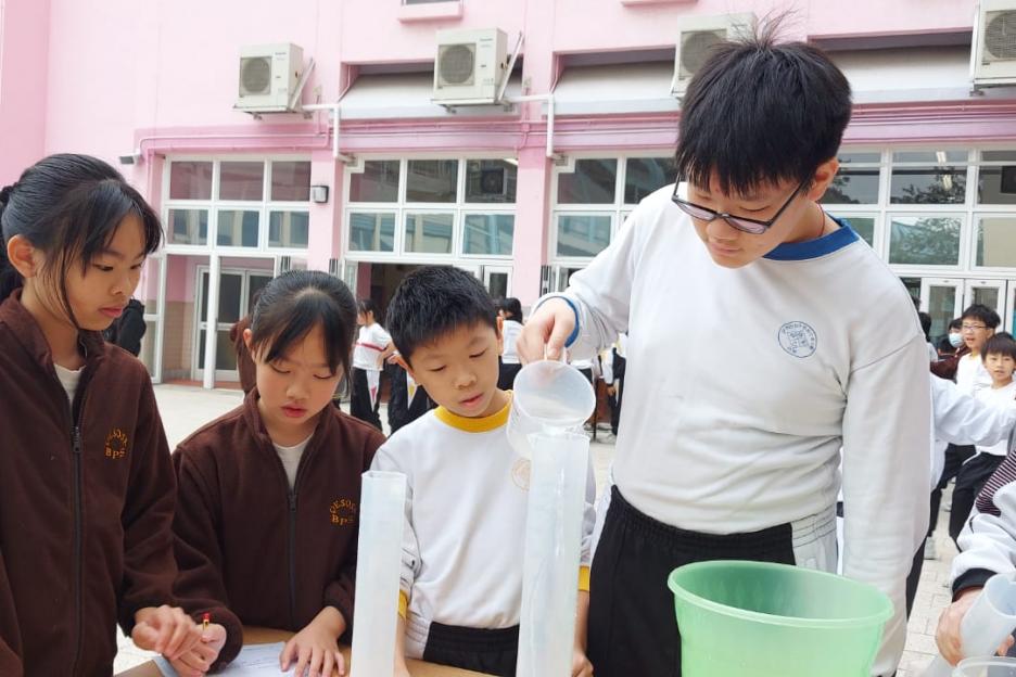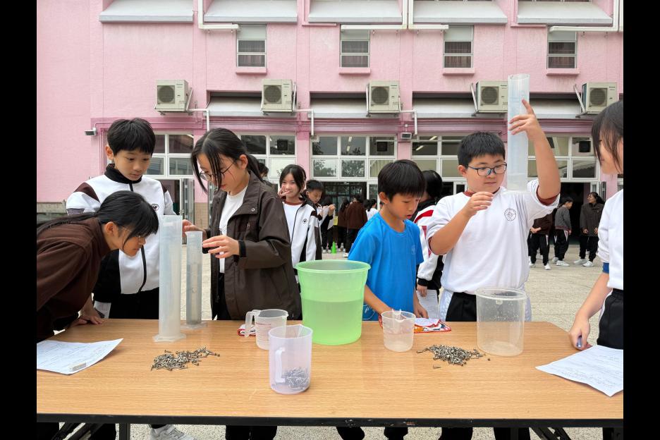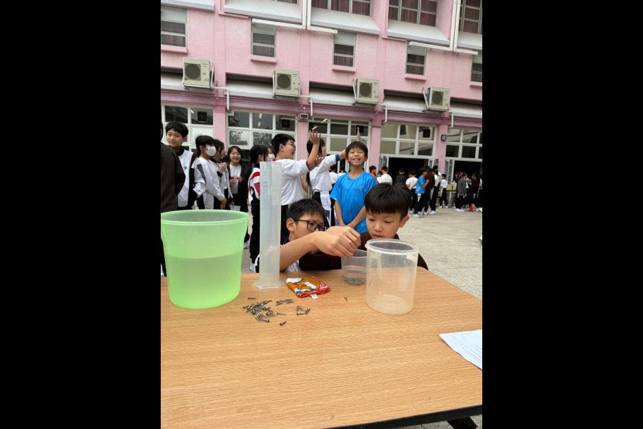 活動簡介 | 安排六年級學生進行數學科活動『探究不規則立體的體積』,學生透過親身操作利用不同的量度工具,包括量杯和排水桶,以排水法找出不規則立體(石塊、波子、螺絲釘、海綿塊、乒乓球)的體積。學生能探究以排水法找出不規則立體體積的優點及其限制,並透過討論知道除排水法以外能找出不規則立體體積的方法。學生在小組活動中能與同學融洽相處,一起討論和解決問題,從而學生能培養多角度思考的能力。 |