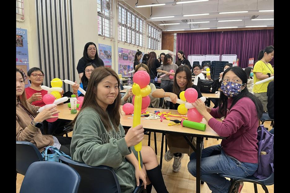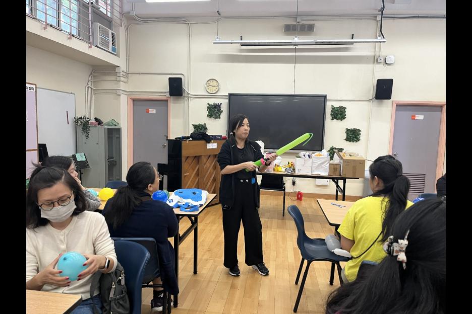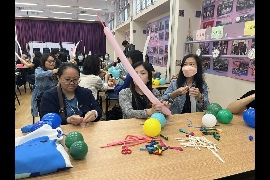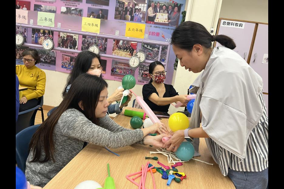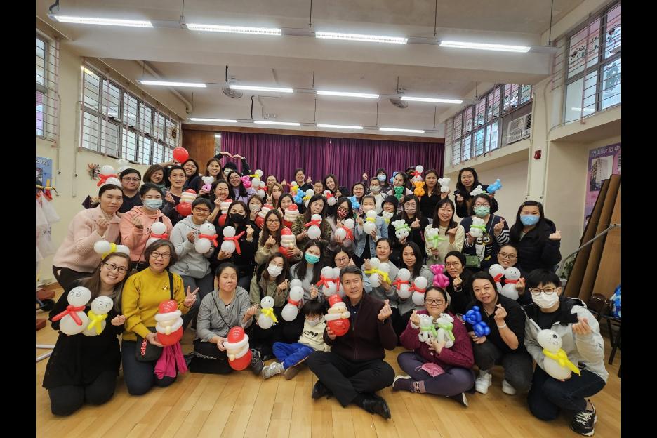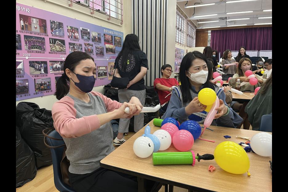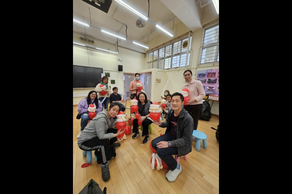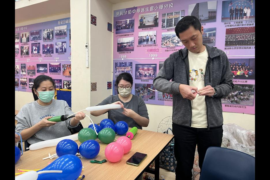 家長義工一起學習扭氣球,為同學預備滿滿愛心的聖誕禮物。