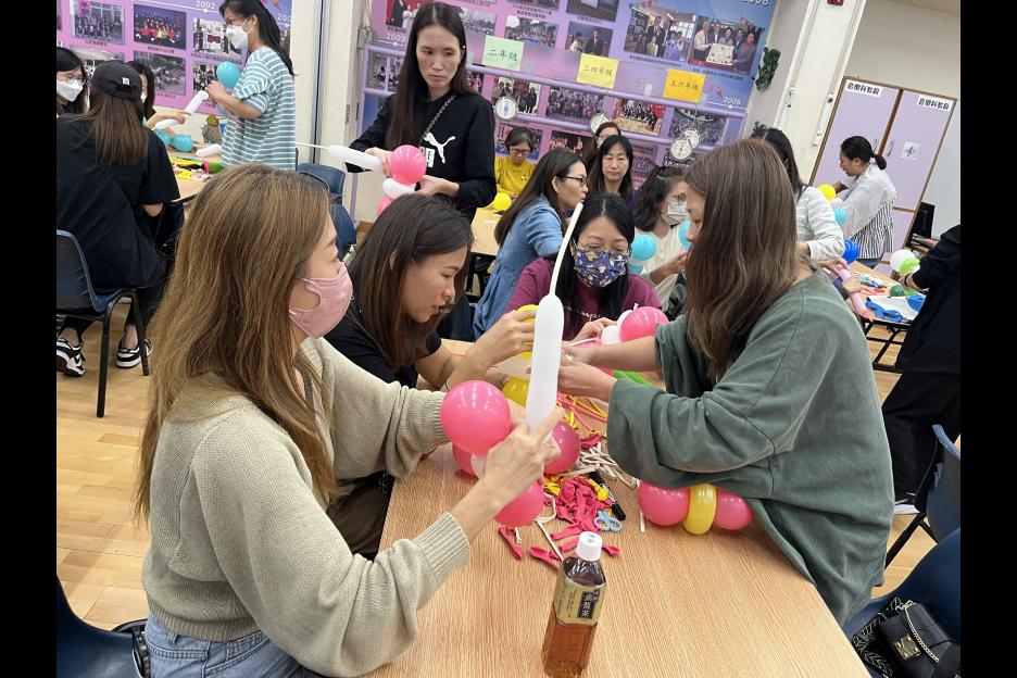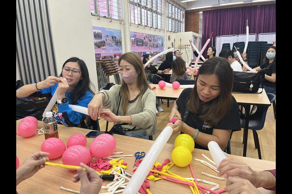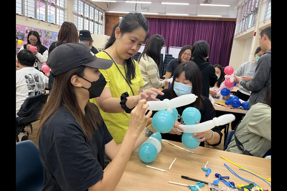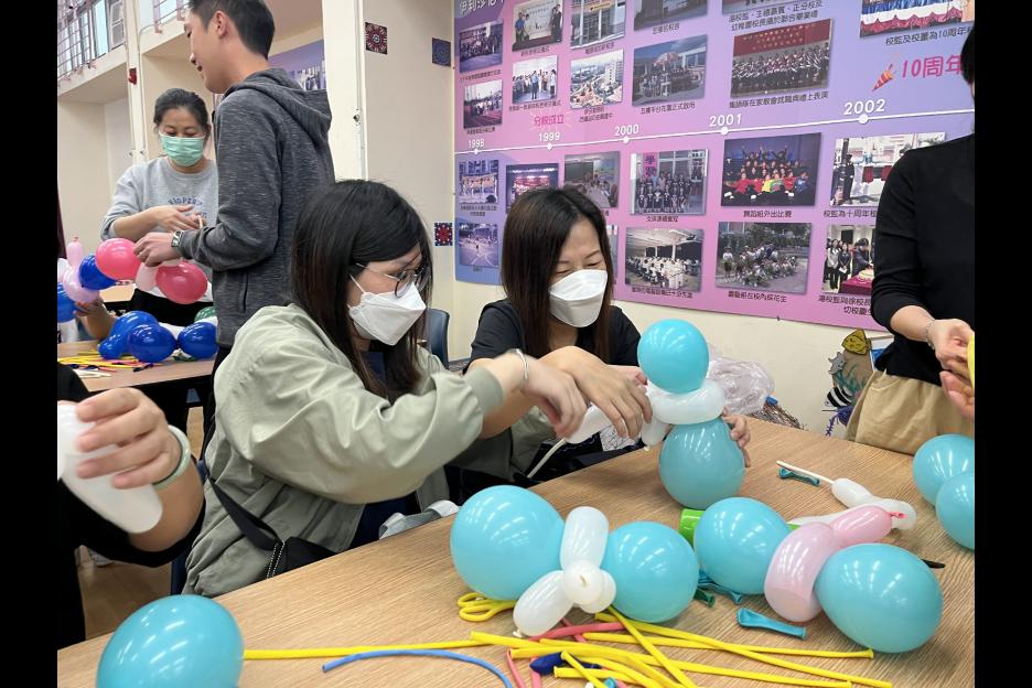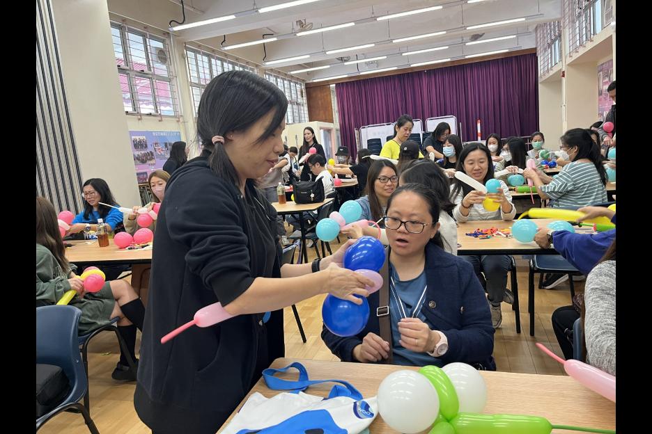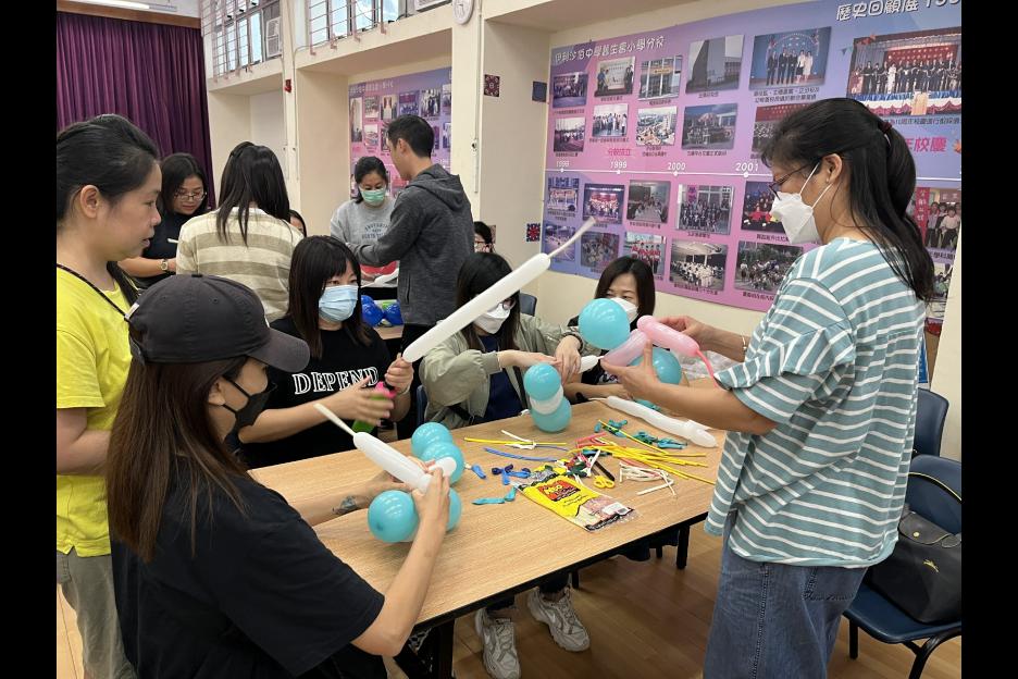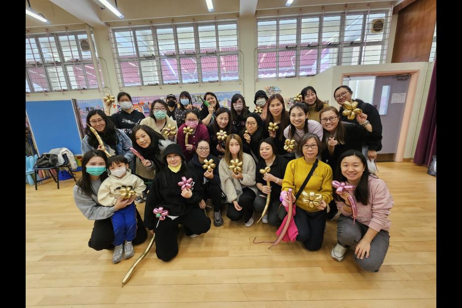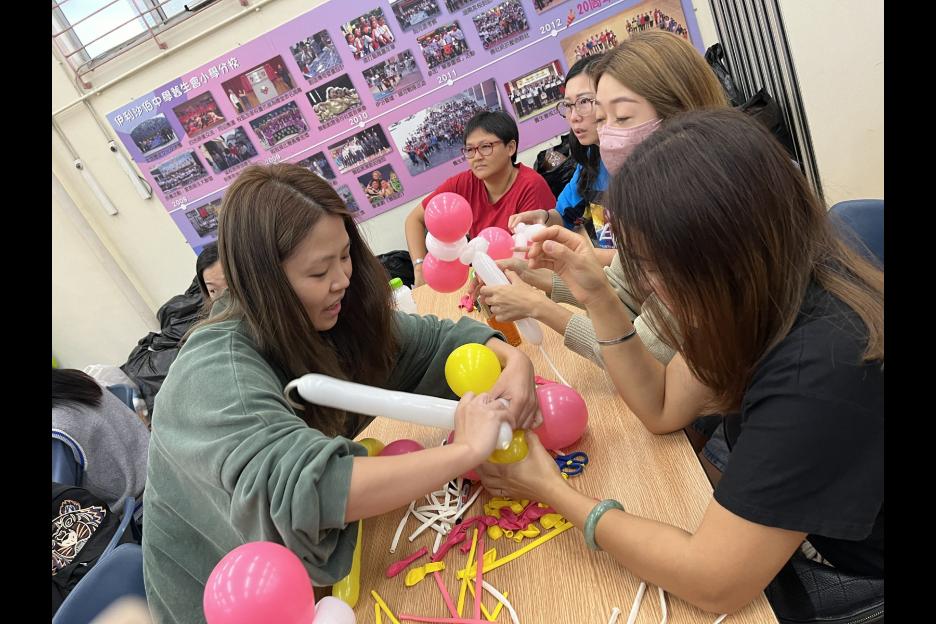 家長義工一起學習扭氣球,為同學預備滿滿愛心的聖誕禮物。