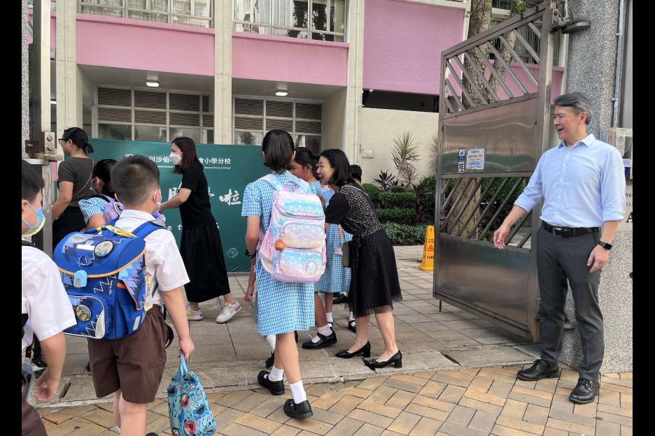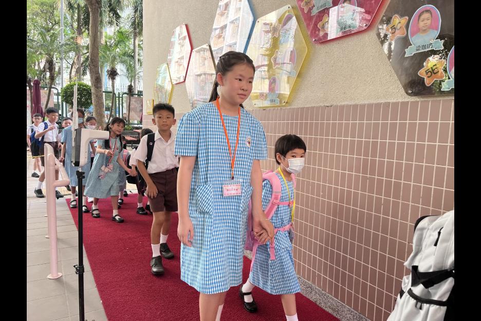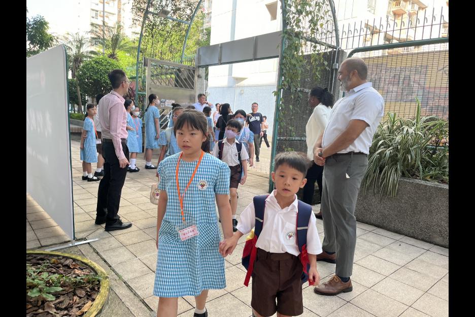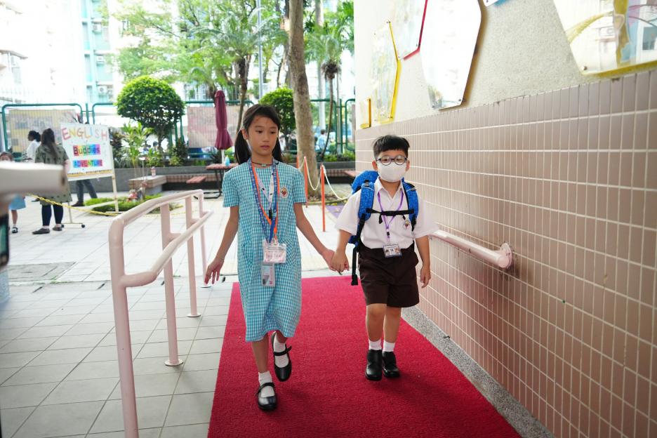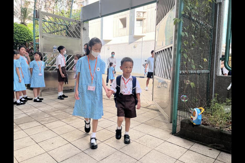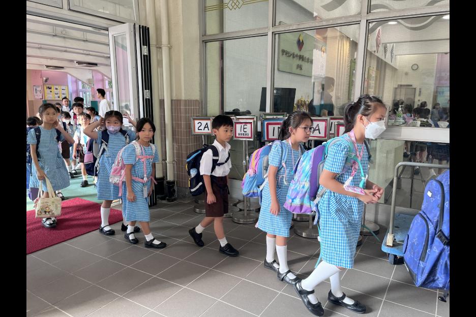 新學年首日上課天,校長、副校長、各教師在正門迎接同學上課,同學們都精神抖擻背起書包進入校園,展開新學年各項學習活動。愛心小天使哥哥姐姐會主動手牽手陪伴小一同學進入課室,讓小一同學能適應及享受小學新的學習環境。
