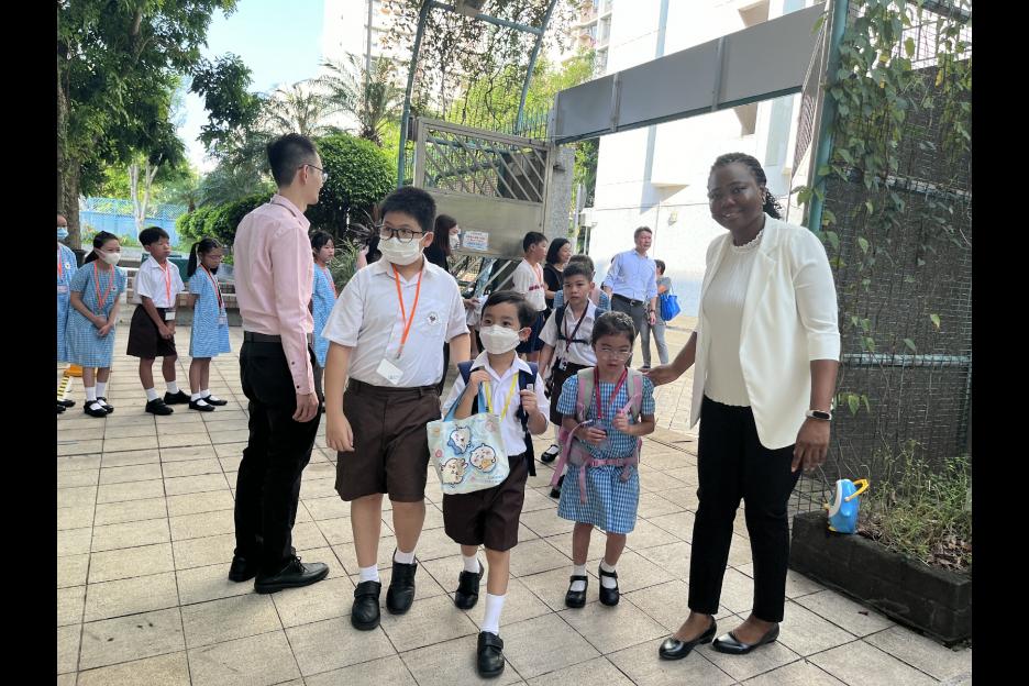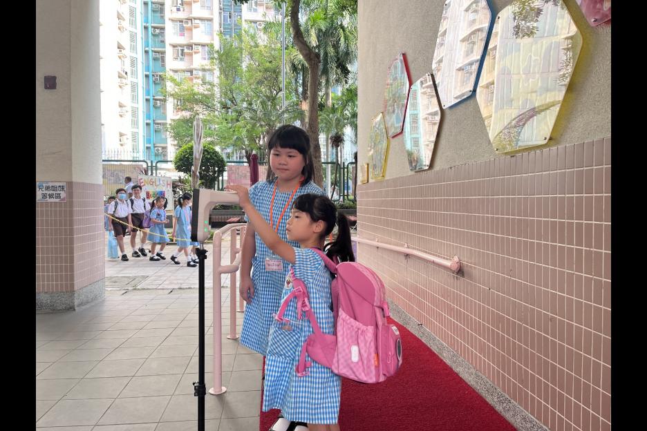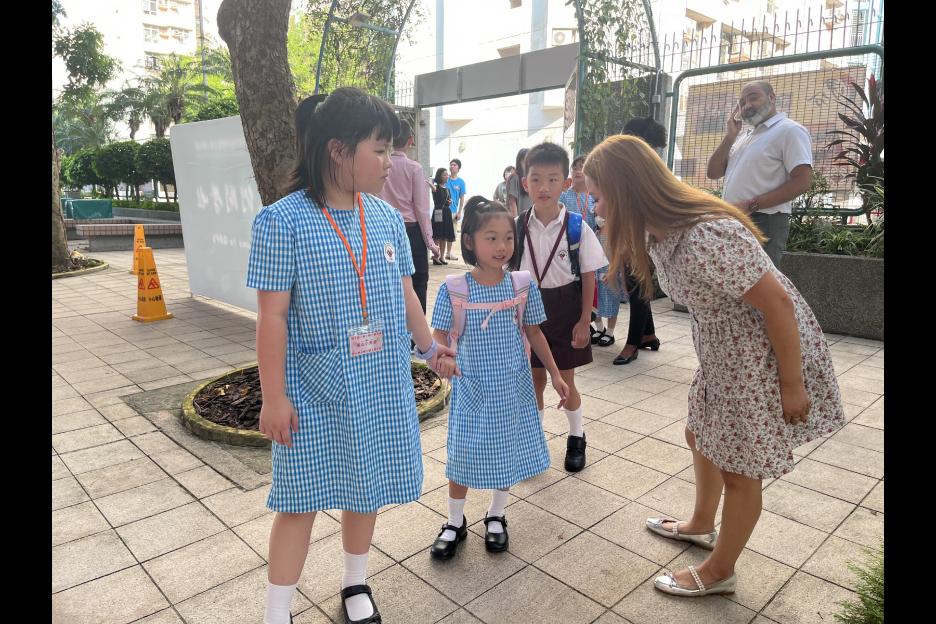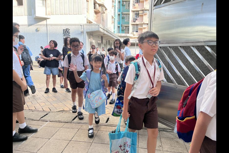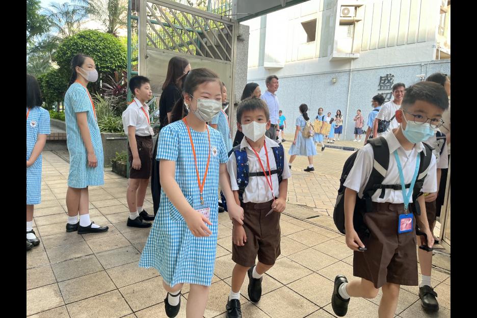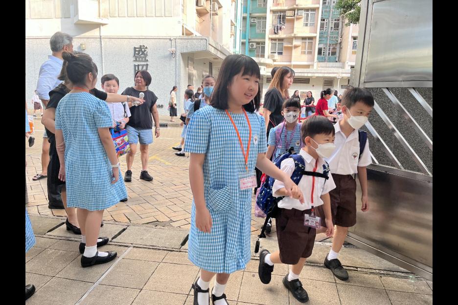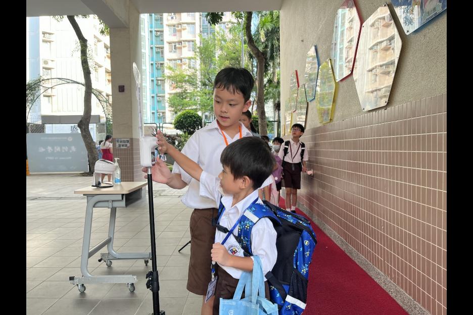 新學年首日上課天,校長、副校長、各教師在正門迎接同學上課,同學們都精神抖擻背起書包進入校園,展開新學年各項學習活動。愛心小天使哥哥姐姐會主動手牽手陪伴小一同學進入課室,讓小一同學能適應及享受小學新的學習環境。