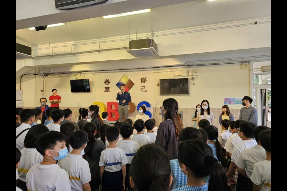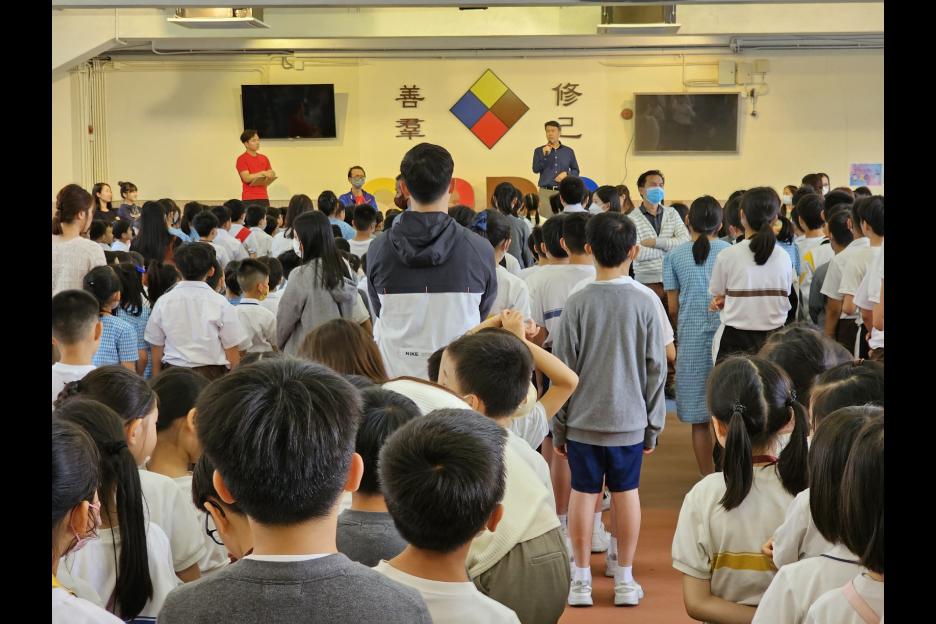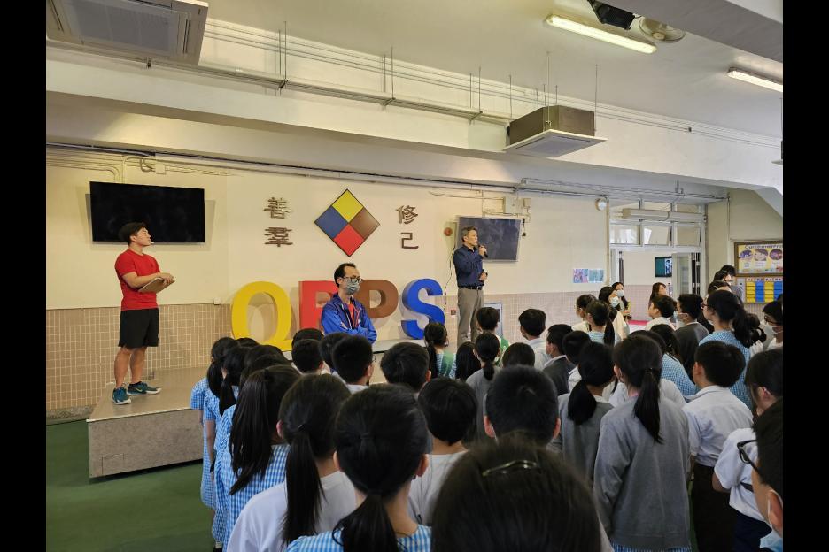 全校師生進行了火警演習,當火警鐘聲響起,同學們都留心地聽宣布,跟隨老師帶領到地下操場集合。