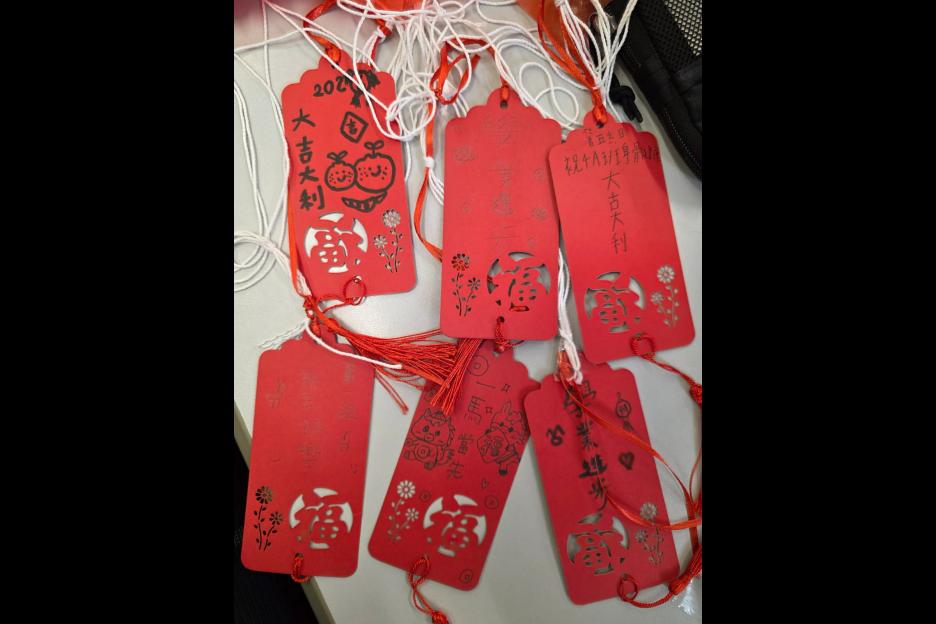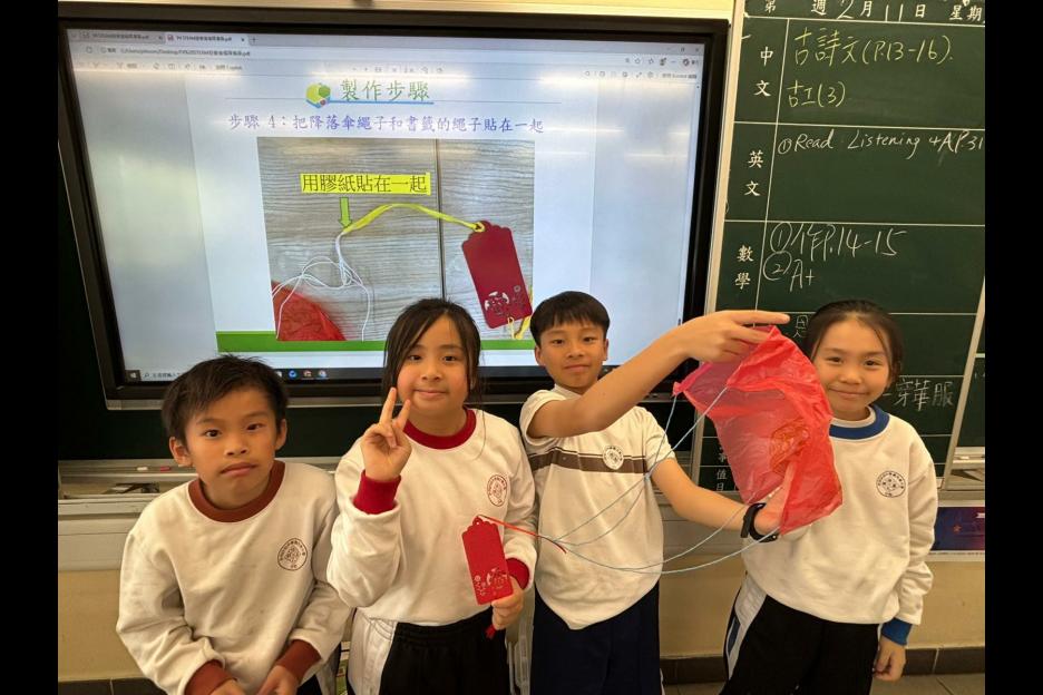 數學科STEAM活動「迎春接福降落傘」配合中國傳統節日「農曆新年」,設計一個可在空中停留5秒的降落傘。看看你的降落傘在全班中,可否成為在空中停留時間最長的降落傘。 同學都紛紛在降落傘寫上「新年快樂、學業進步等等」的新年祝福語,享受活動之餘,亦預祝來年更好。