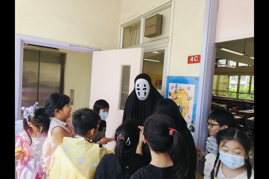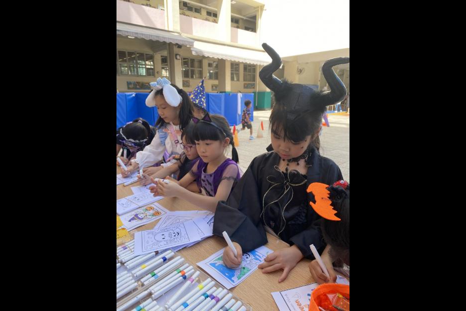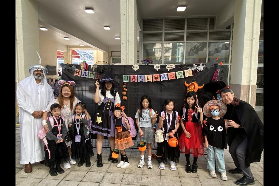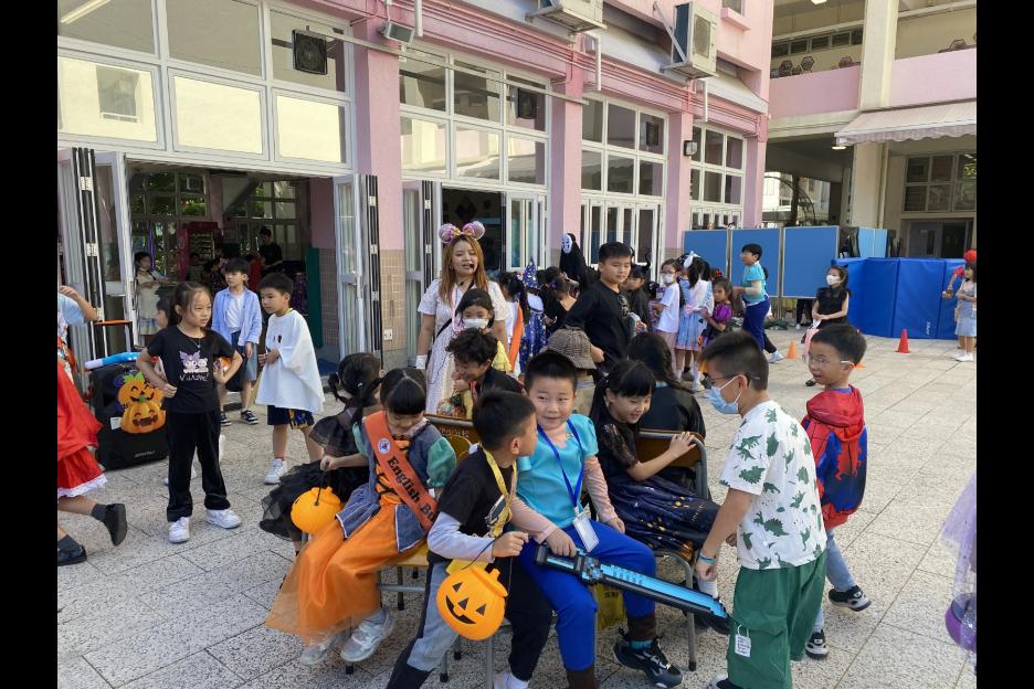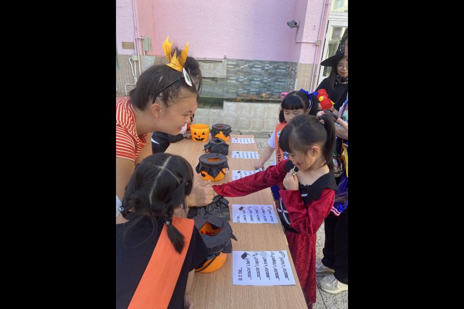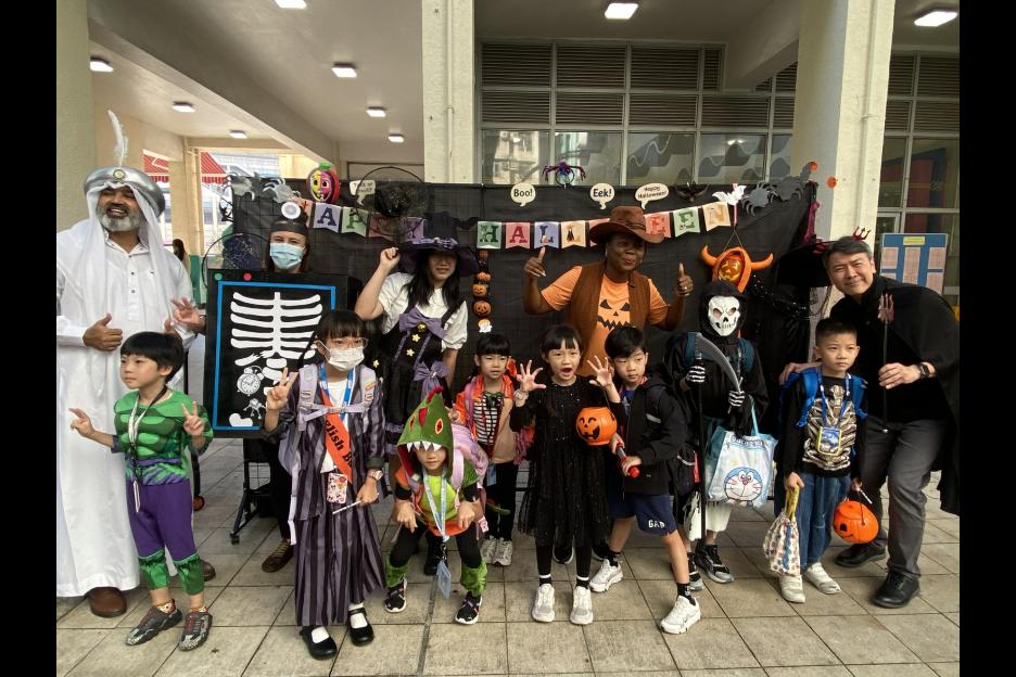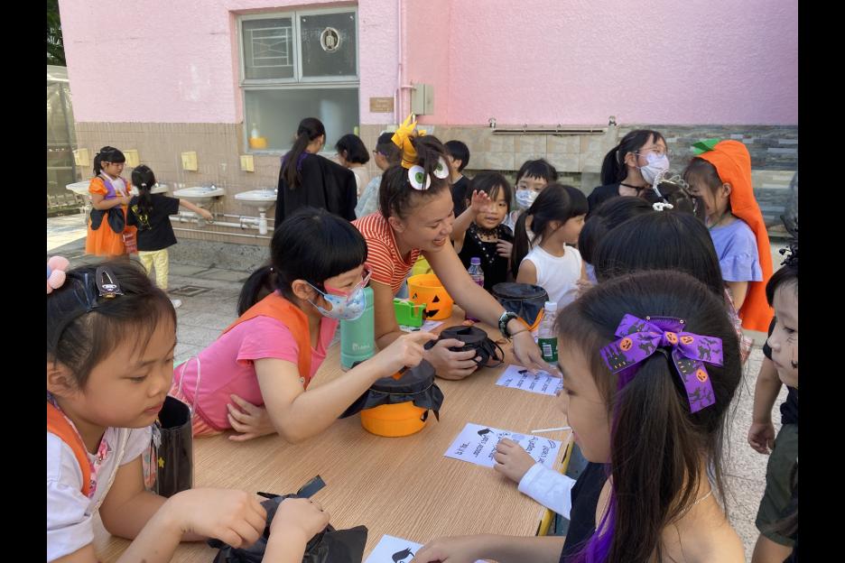 全校一起穿著萬聖節服裝,一起進行trick-or-treat, 並參加趣味英文攤位遊戲。