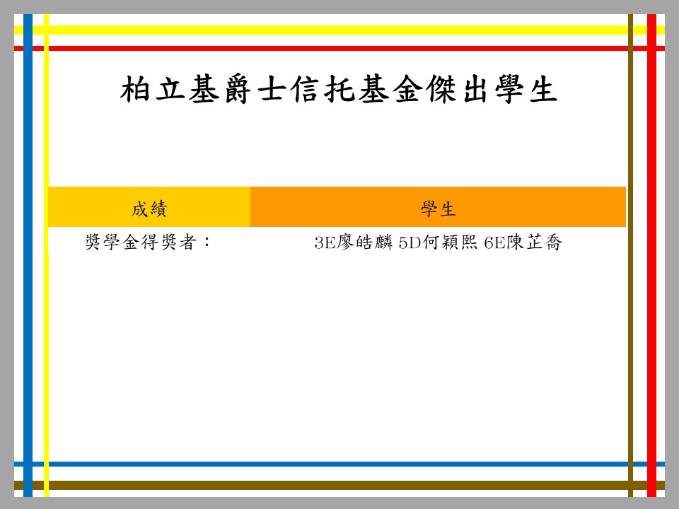 獎學金得獎者: 3E廖皓麟 5D何穎熙 6E陳芷喬