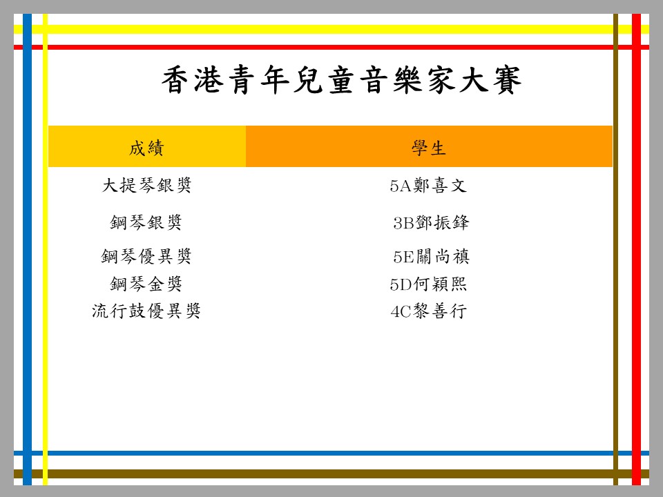 大提琴銀奬 5A鄭喜文 鋼琴銀奬 3B鄧振鋒 鋼琴優異奬 5E關尚禛 鋼琴金獎 5D何穎熙 流行鼓優異獎 4C黎善行
