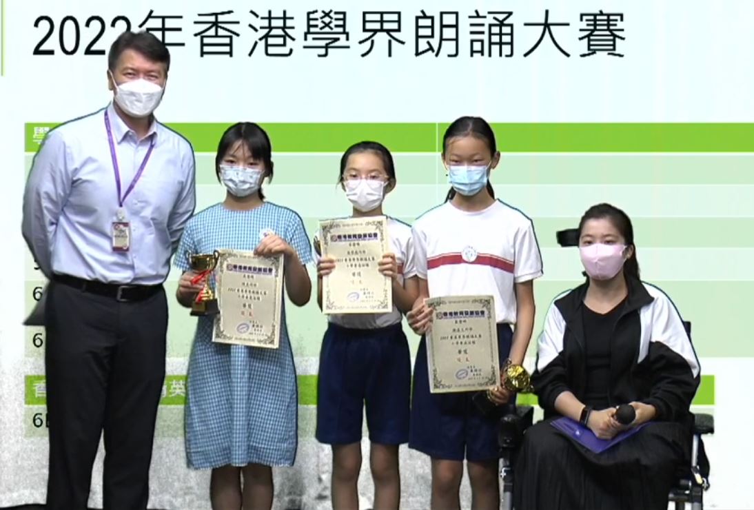 2022年香港學界朗誦大賽亞軍 2B吳冠希季軍 5C丁梓瑜 6B吳凱琳優良 3C陳昱嵐 5C陳熹 6A鄭喜文 6E羅學蘊香港學界朗誦精英大賽 卓越殊榮 6B吳凱琳