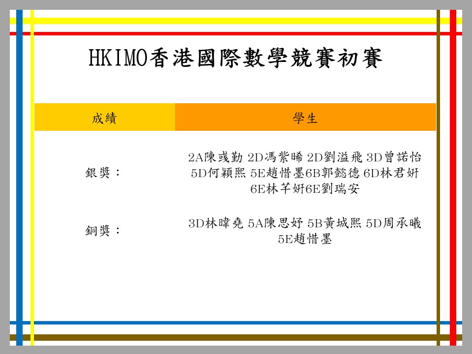 銀獎:2A陳彧勤 2D馮紫晞 2D劉溢飛 3D曾諾怡5D何穎熙 5E趙惜墨6B郭懿德 6D林君姸6E林芊姸6E劉瑞安銅獎:3D林暐堯 5A陳思妤 5B黃城熙 5D周承曦5E趙惜墨