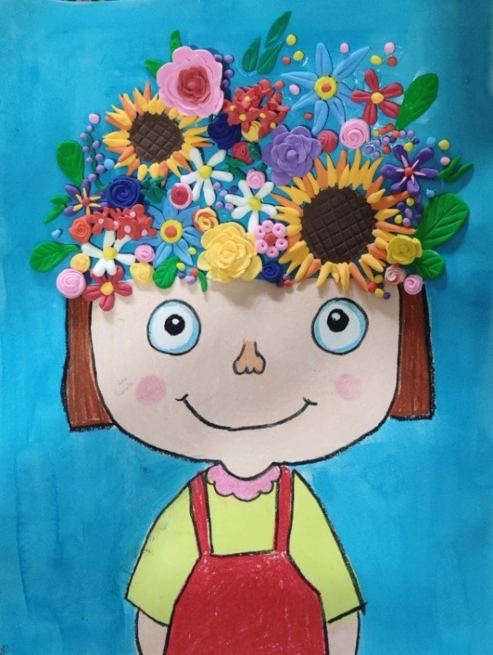 停課前,視藝老師分享了幾米的《我們不是完美的小孩》。作品上的女孩笑得很開心,頭上放滿七彩繽紛的花朵。我看完後心情愉快,所以我參考這個作品來創作。希望我的作品,也能令大家心情愉快。