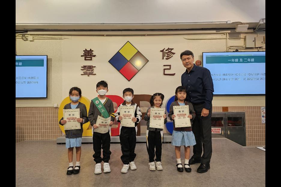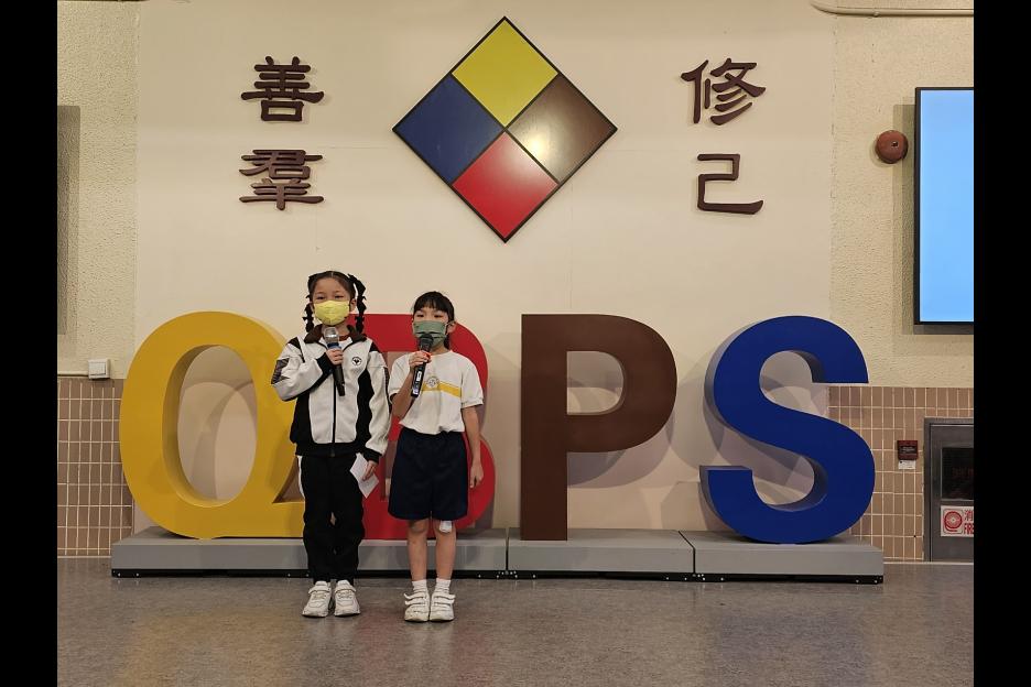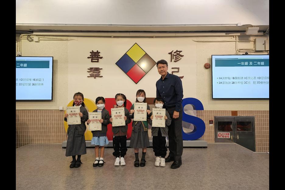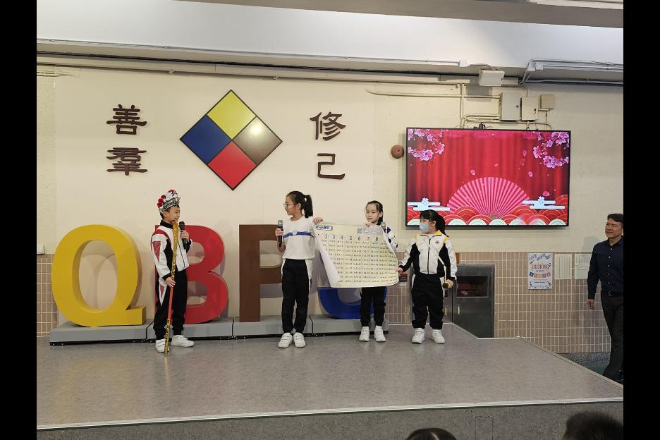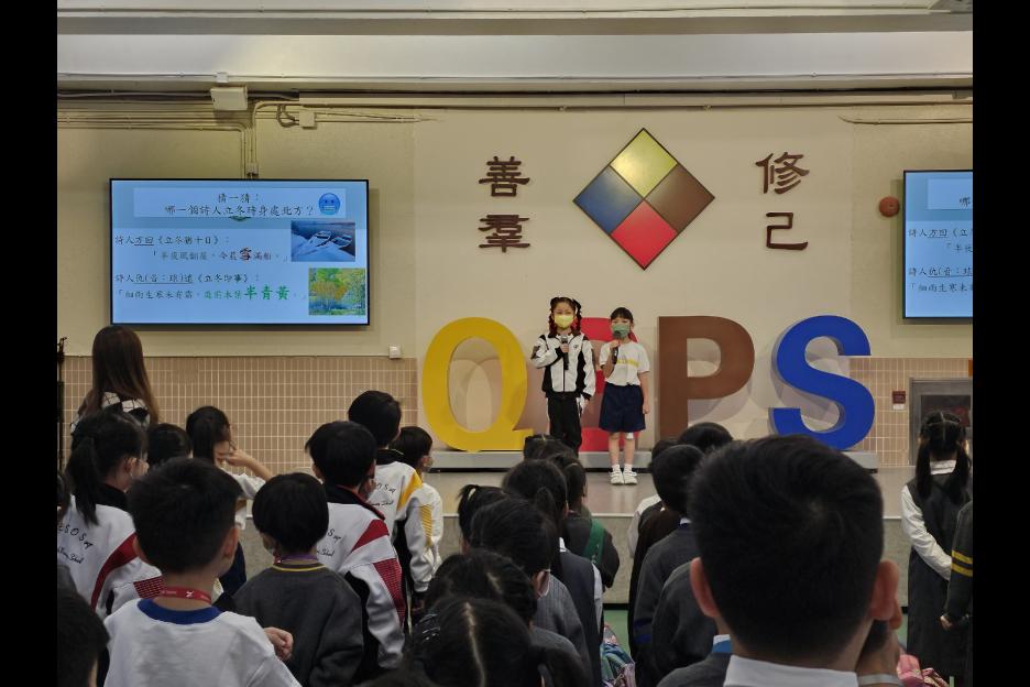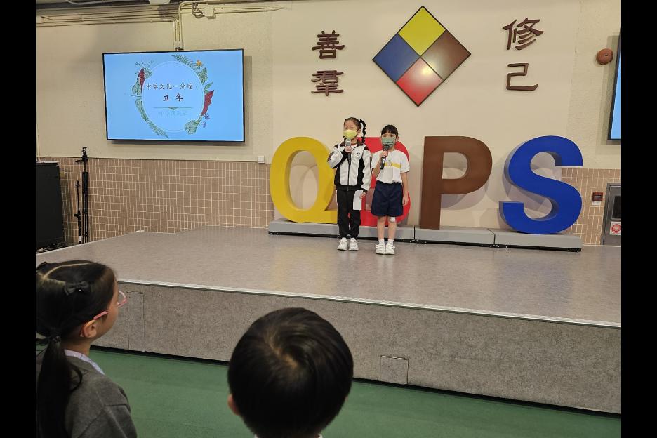 天氣轉涼,大部分學生了穿着外套進行今天的普通話早會。早會開始是由中文科分享「立冬」的知識,然後是每月之星的獎項頒發,十月的主題是「關愛」。最後是數學科的宣傳,扮演「關羽」的同學揮動大刀扮得維妙維肖。