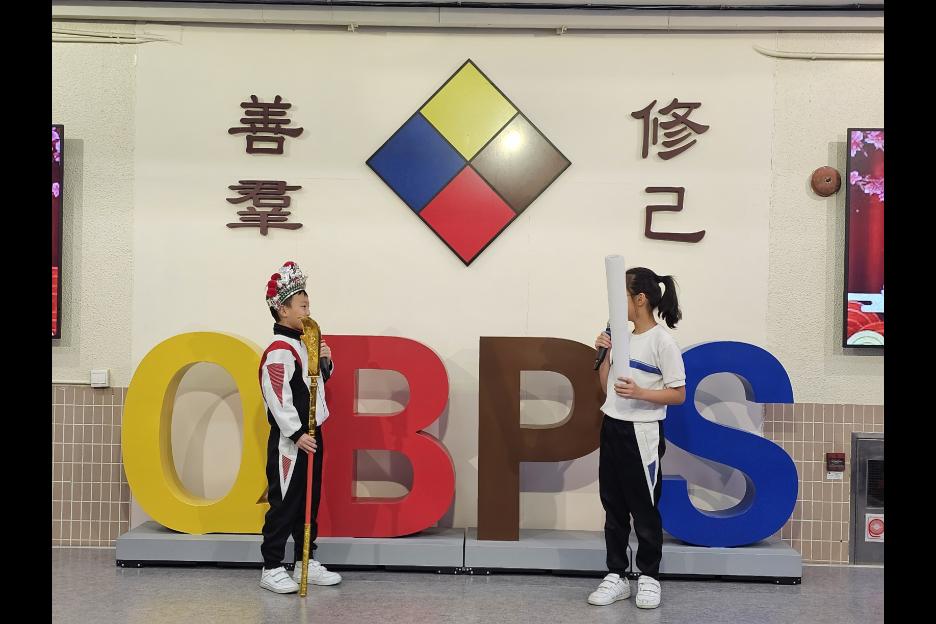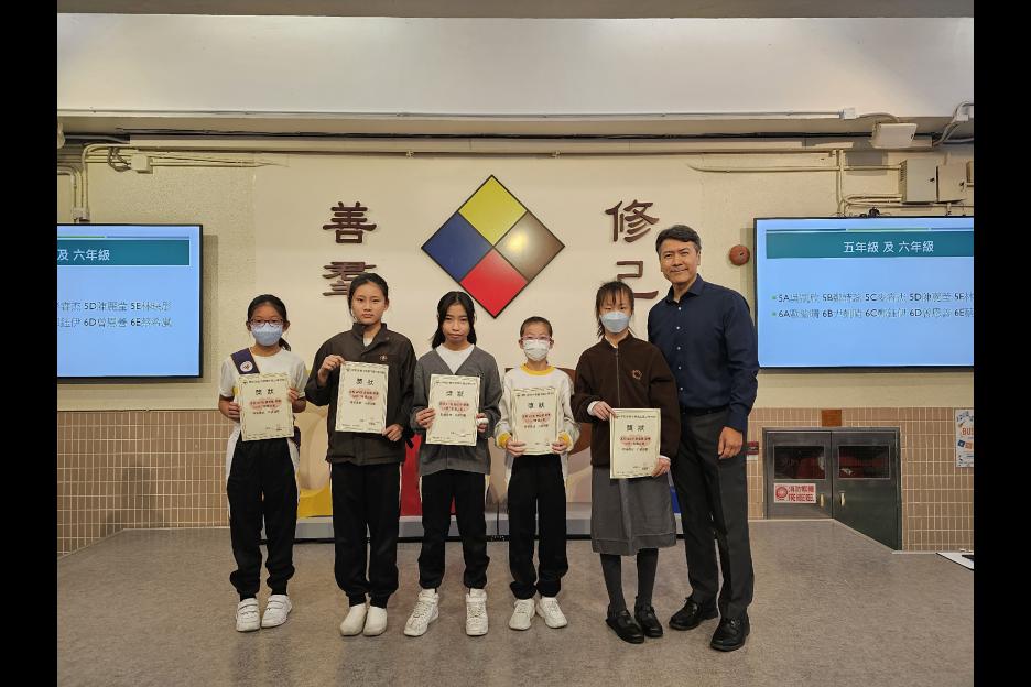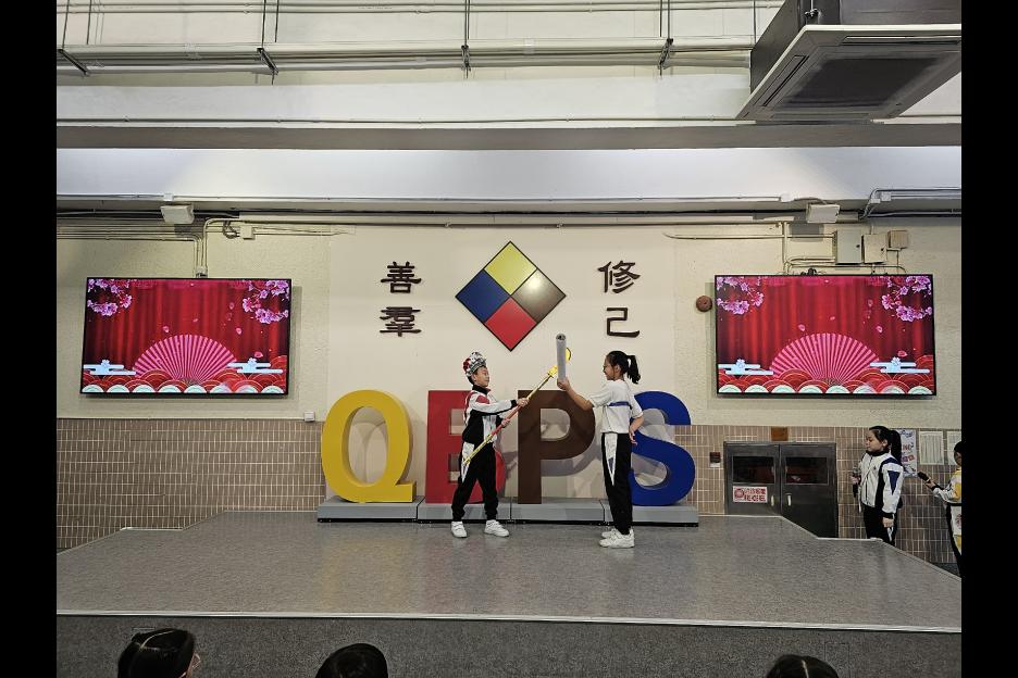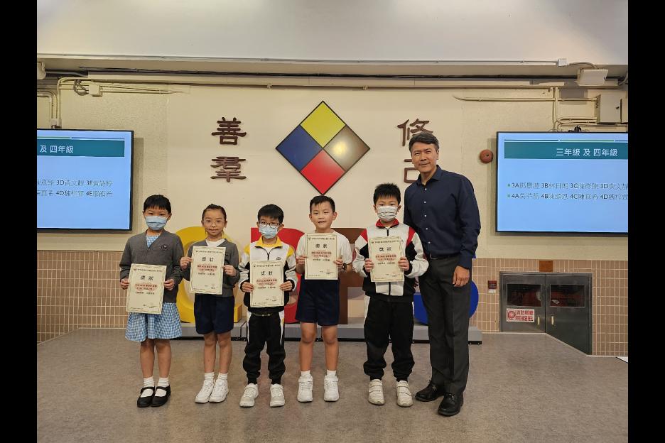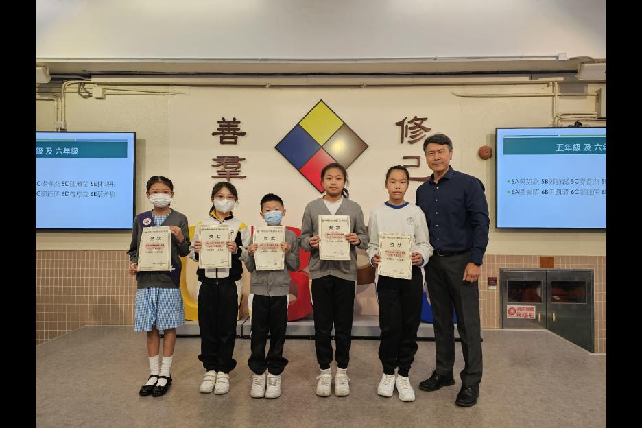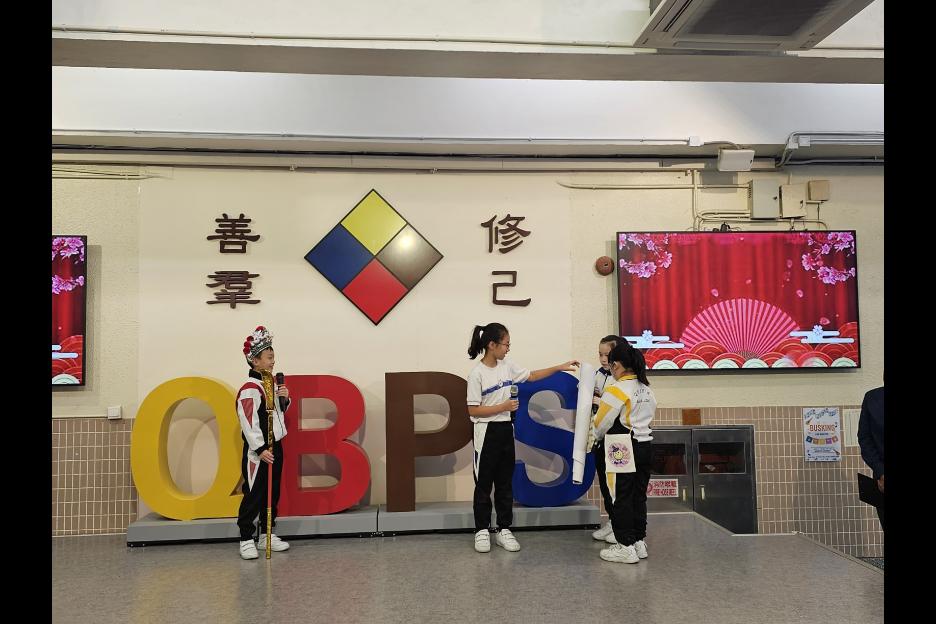 天氣轉涼,大部分學生了穿着外套進行今天的普通話早會。早會開始是由中文科分享「立冬」的知識,然後是每月之星的獎項頒發,十月的主題是「關愛」。最後是數學科的宣傳,扮演「關羽」的同學揮動大刀扮得維妙維肖。