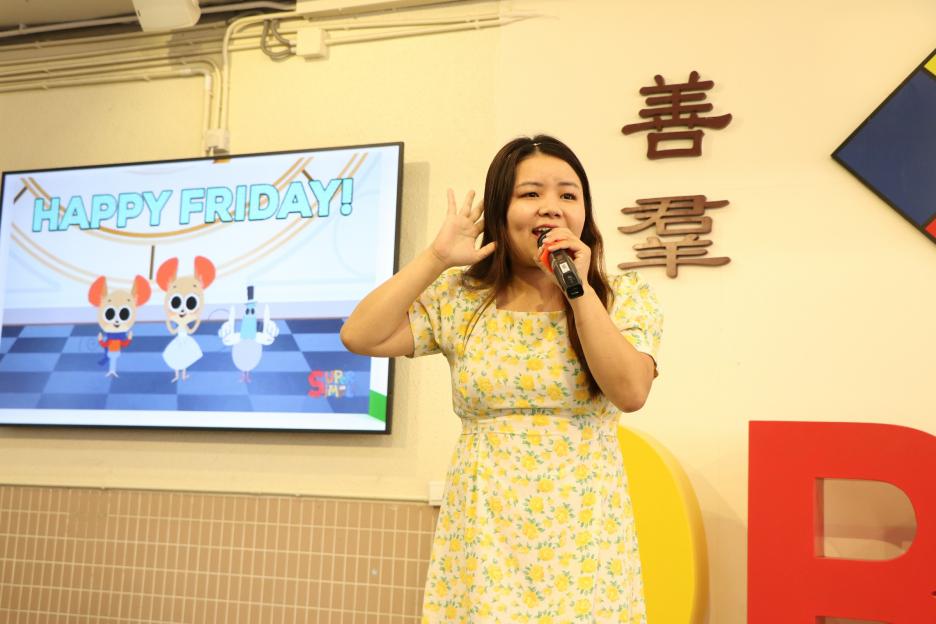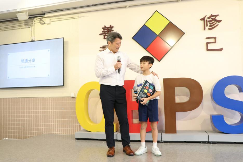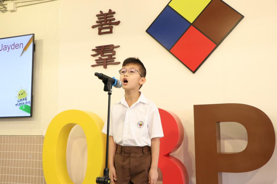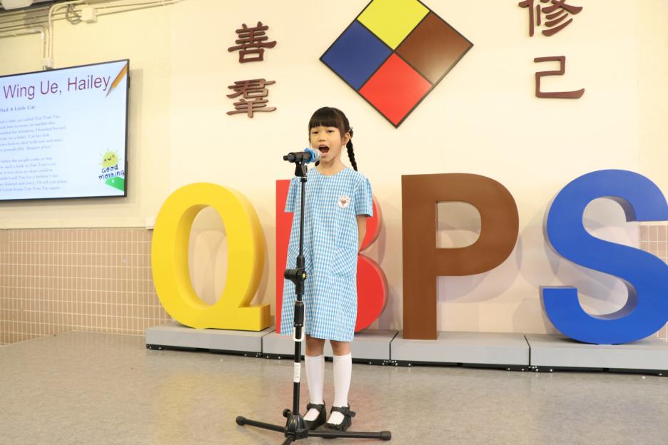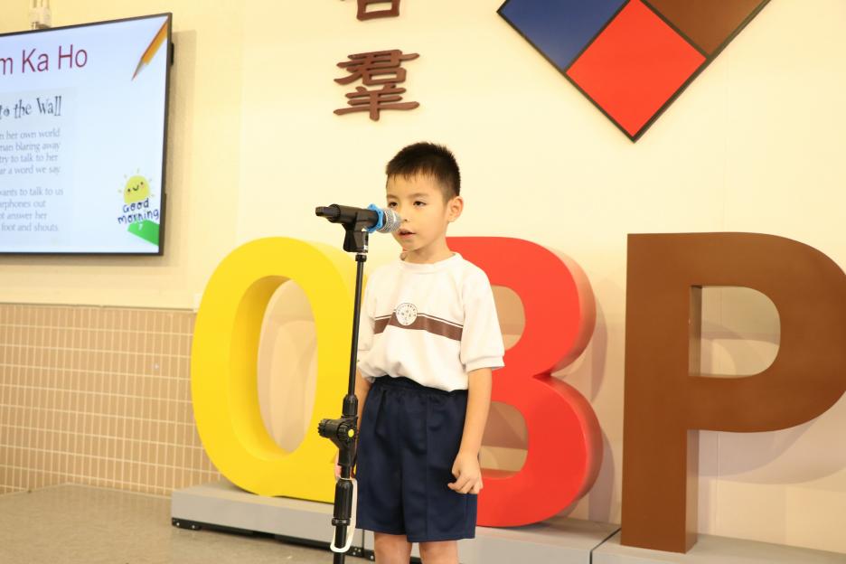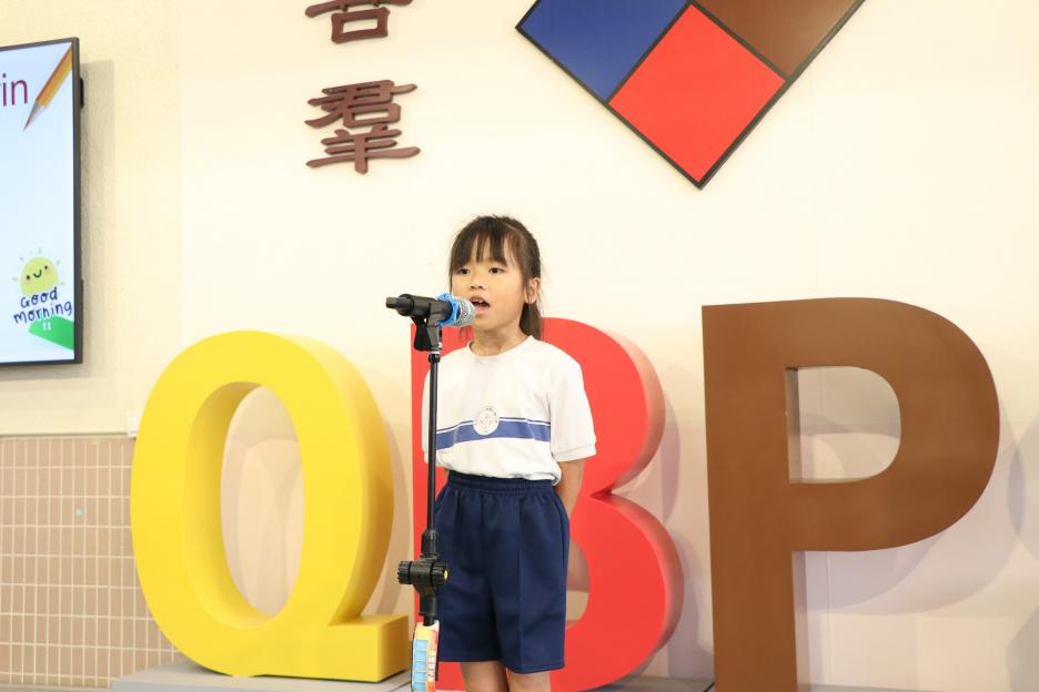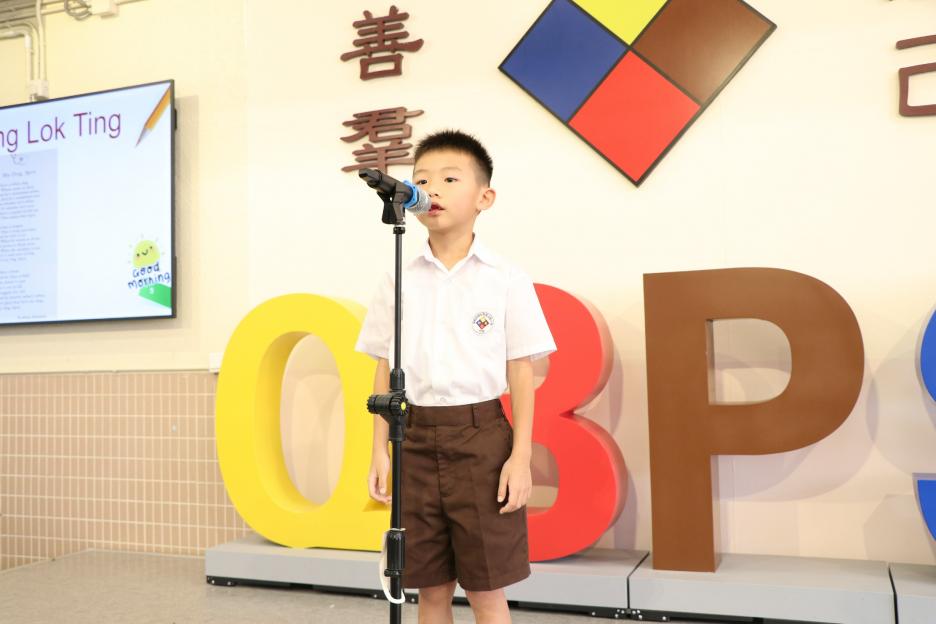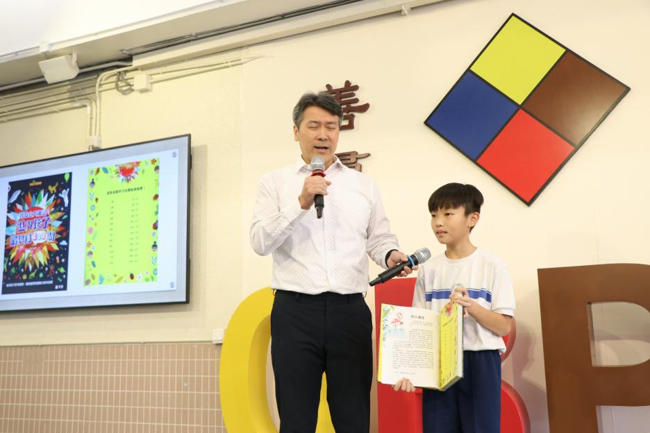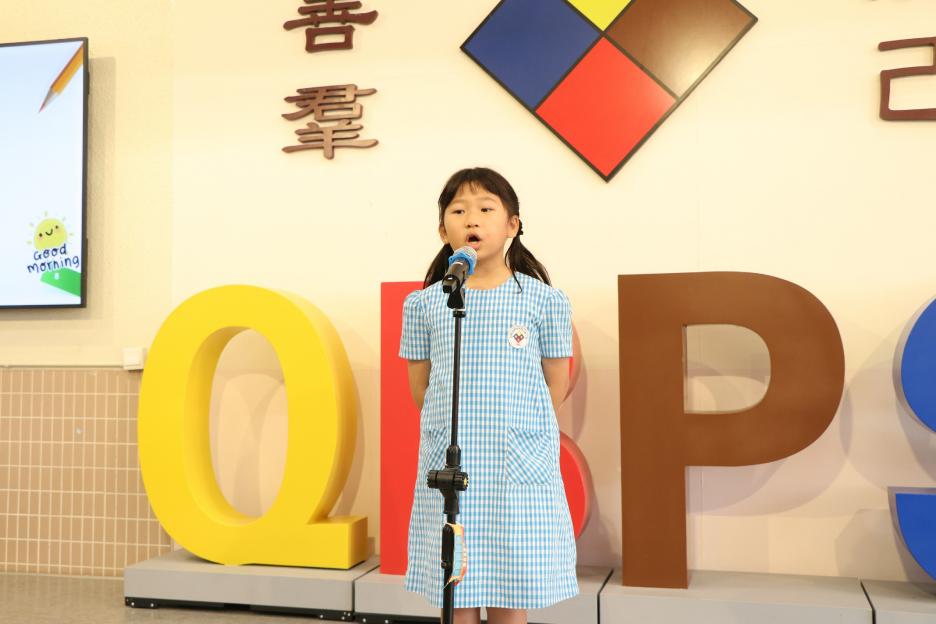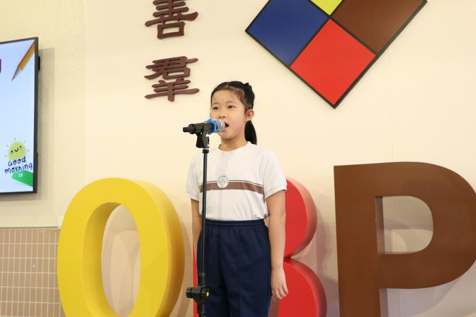今天由外籍老師主持「Happy Friday」的早會,由於英文科將會參加校外的朗誦比賽,所以今天正是參賽者上台練習的好機會。每一位二年級的參賽學生都得到了一個珍貴的表演經驗。最後由校長和學生介紹圖書和分享閱讀的樂趣。