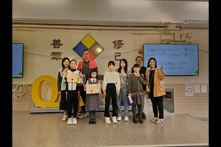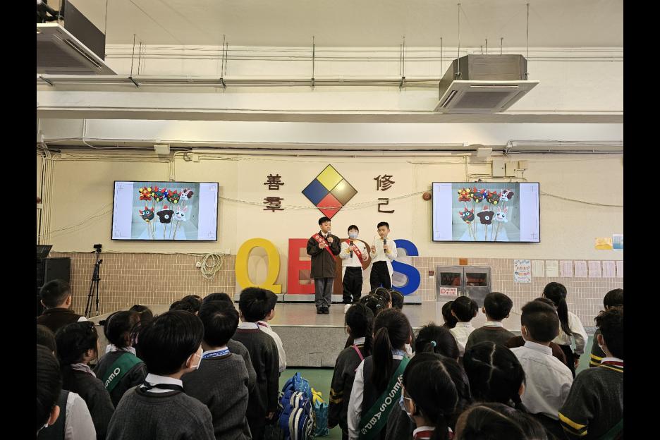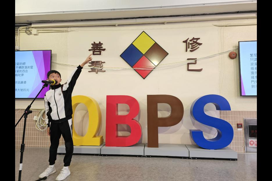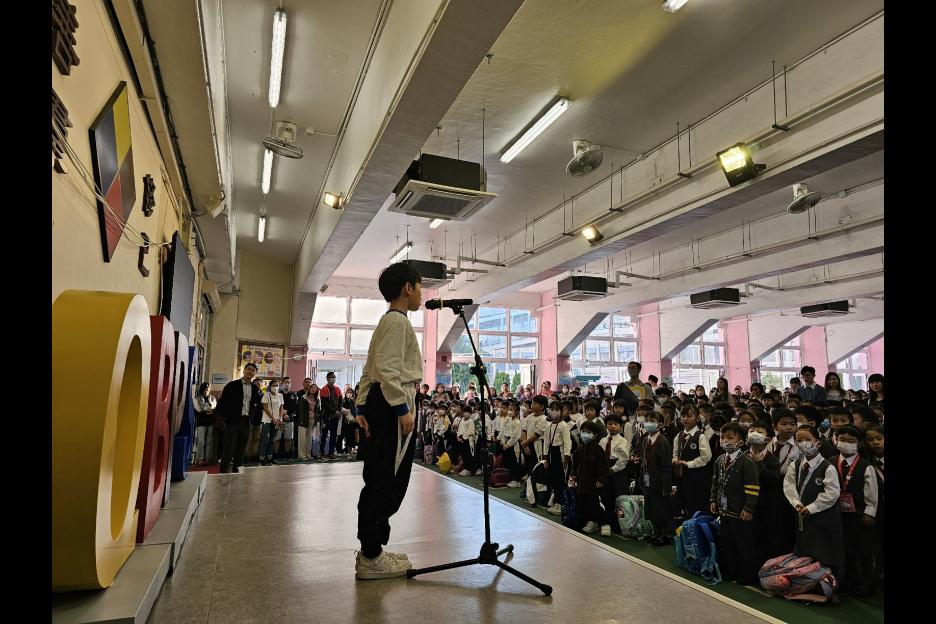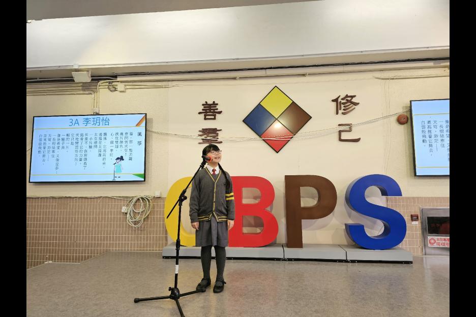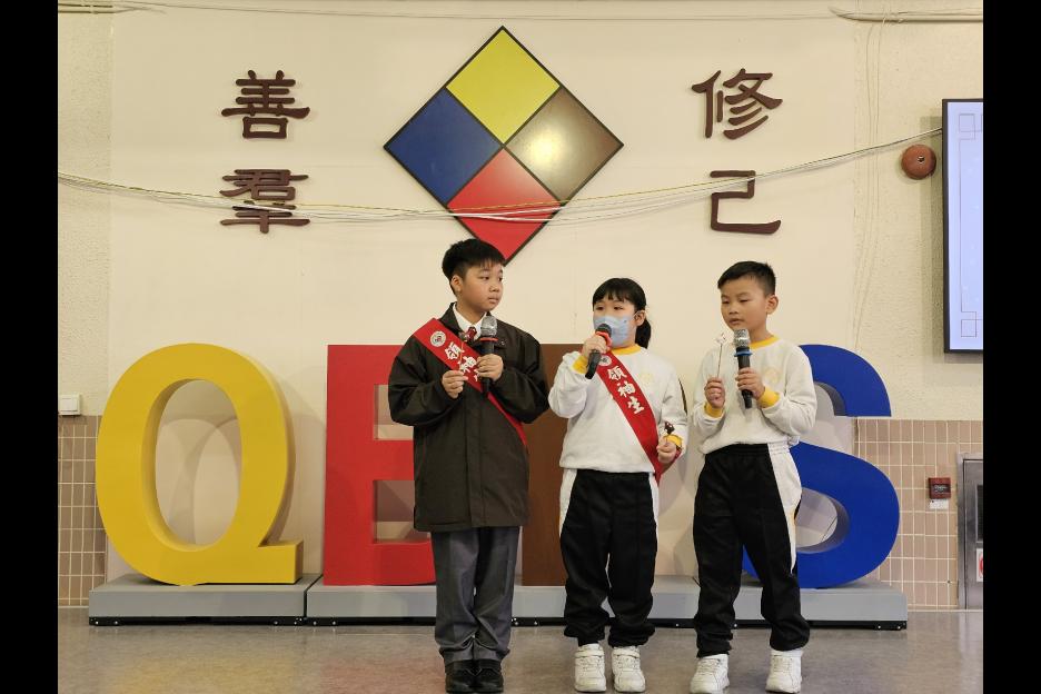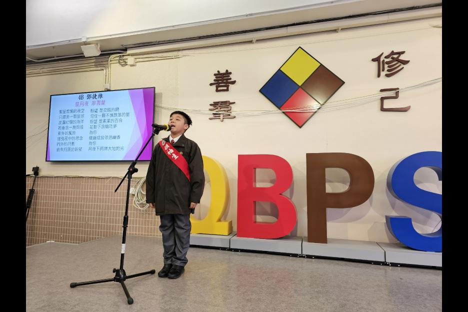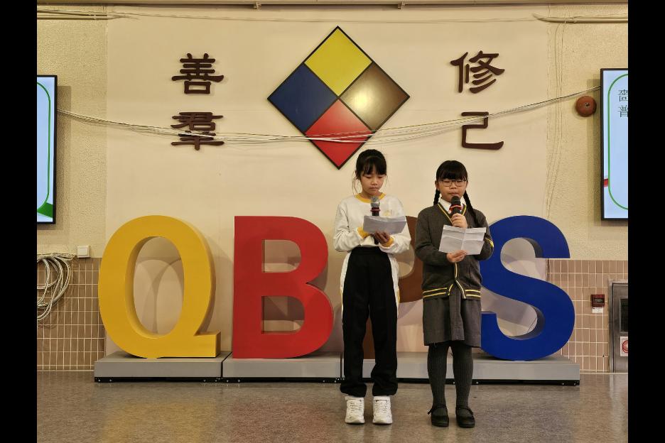 今天同學們都穿着整齊的冬季校服進行早會,參加朗誦比賽的學生們也藉着這次的早會作預賽練習,亦向同學分享練習的成果。然後是硬筆書法比賽的頒獎,得獎同學也向其他同學展示書法的魅力。最後是中華文化日的宣傳活動和普通話朗誦比賽的頒獎。