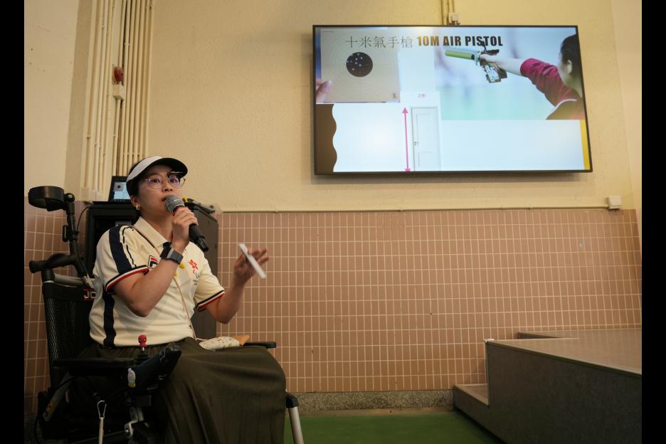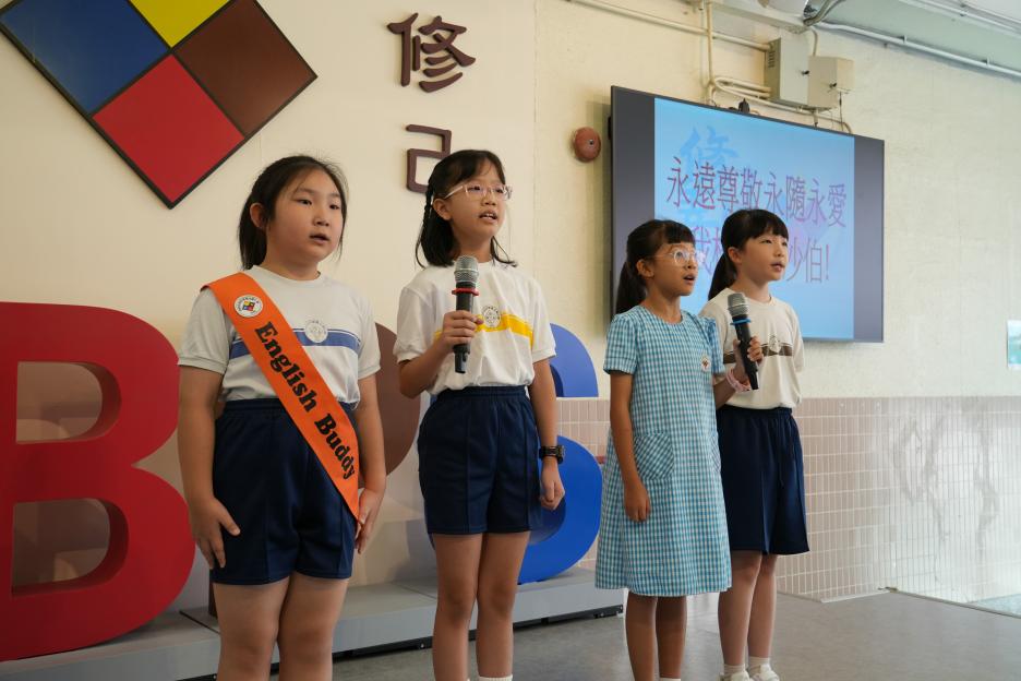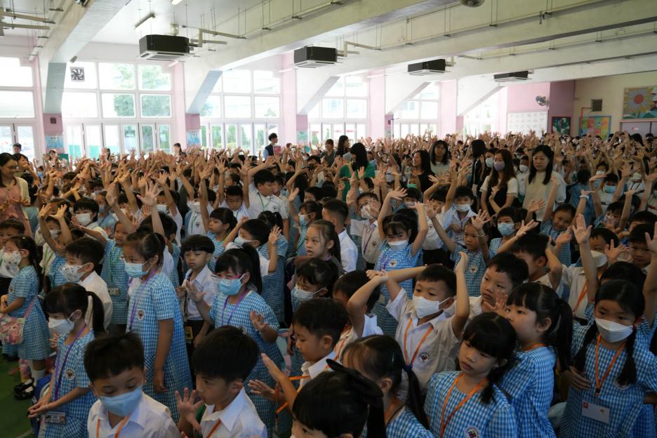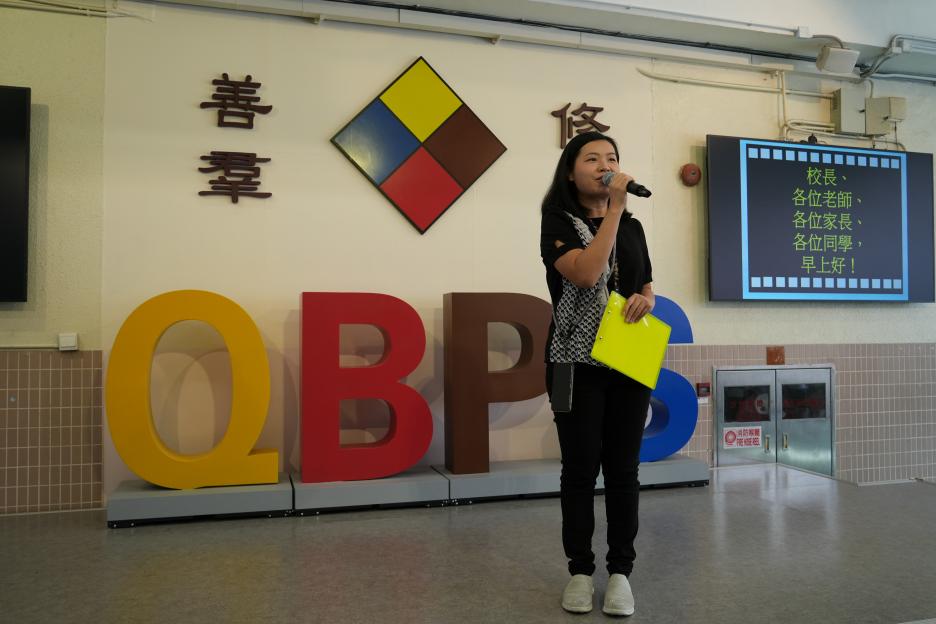 本年度伊分的第一次早會,也是大家在新的彩虹操場裏進行疫情後的第一次早會。先由校歌服務隊帶領大家唱校歌,然後由梁老師主持普通話早會。當天的早會分享環節由本校的香港射擊代表隊成員林錦萍老師分享代表本港出國比賽經驗及感受。雖然第一次學生在復常後進行早會,但他們的投入反應非常熱烈,回應踴躍。