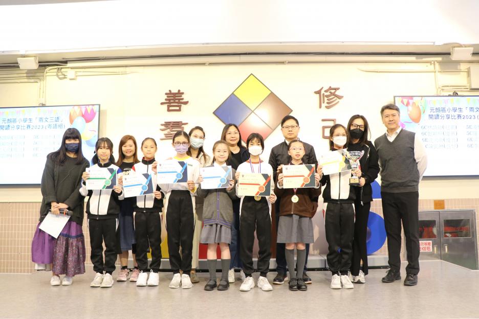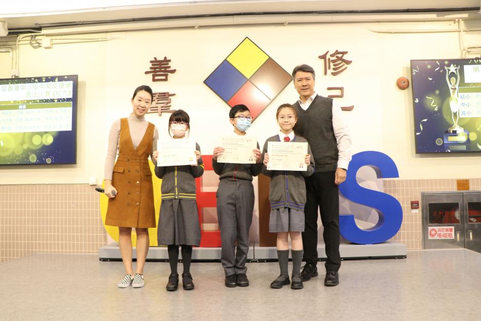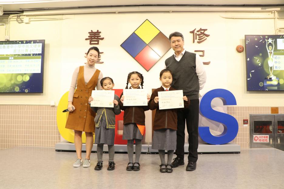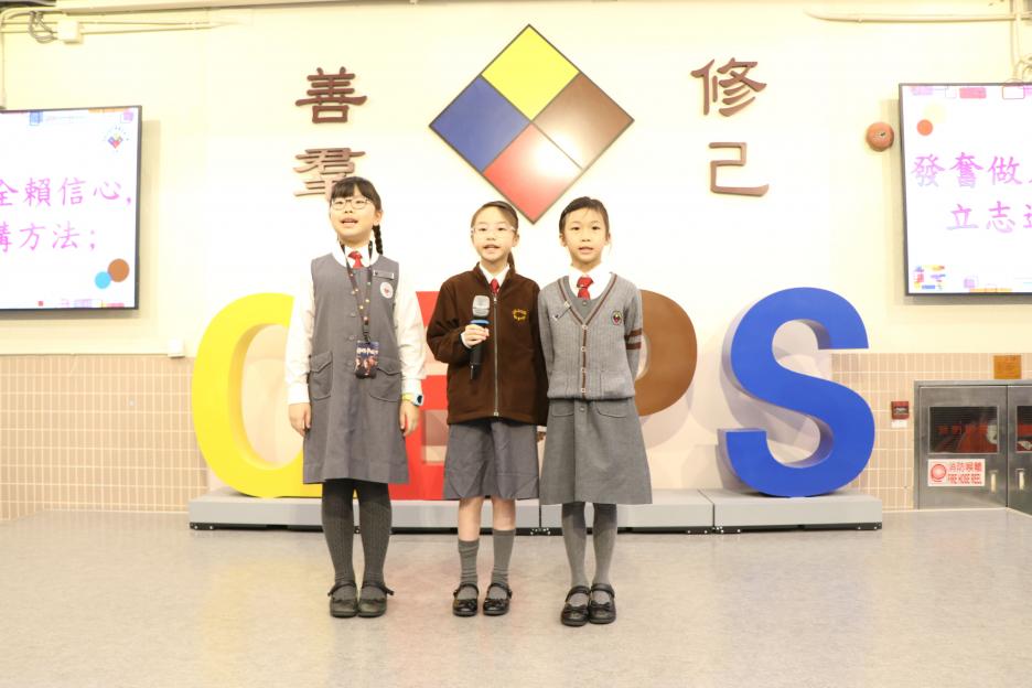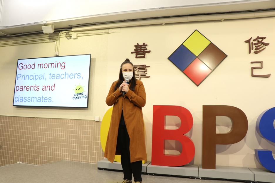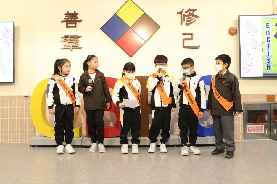 由外籍老師帶領大家進行新一年的第一個早會,先由「English Buddies 」向大家介紹英文科的「Superhero」,然後是硬筆比賽的獎項頒發。「兩文三語閱讀分享比賽」的冠軍短片實在令同學看得津津有味,最後是「鉤織」親子比賽的得獎分享。