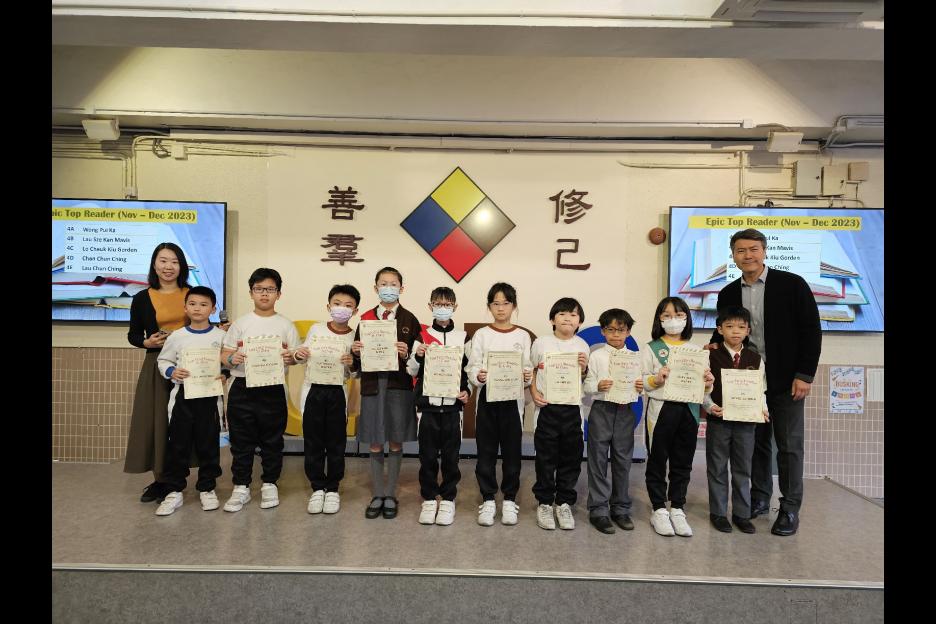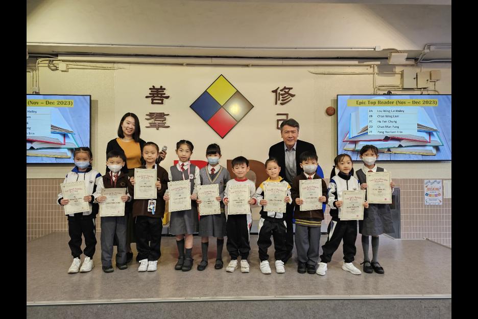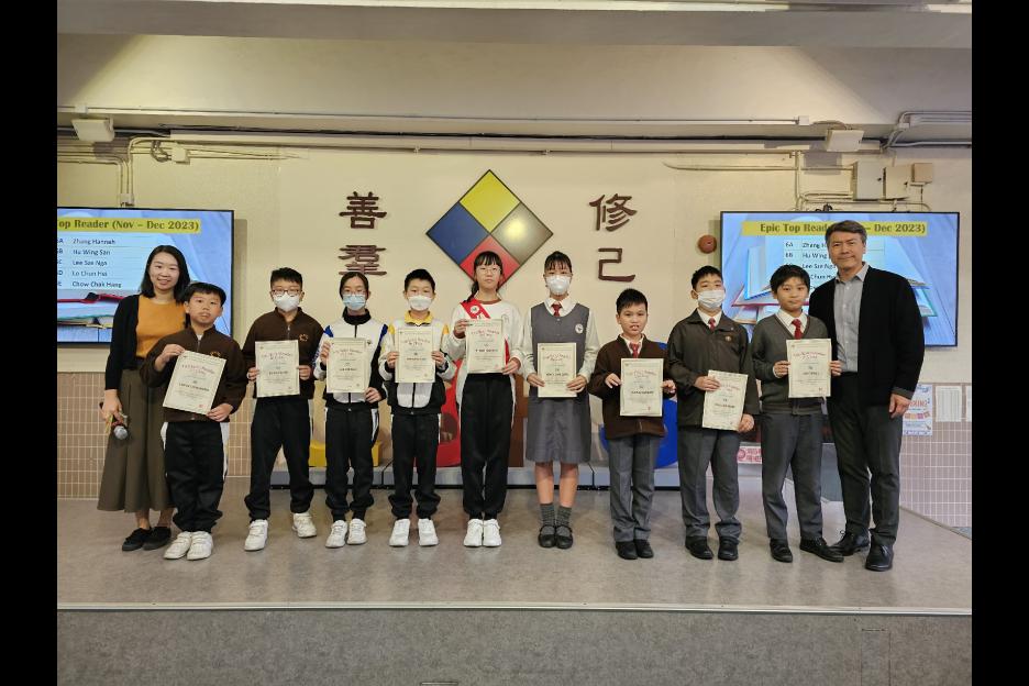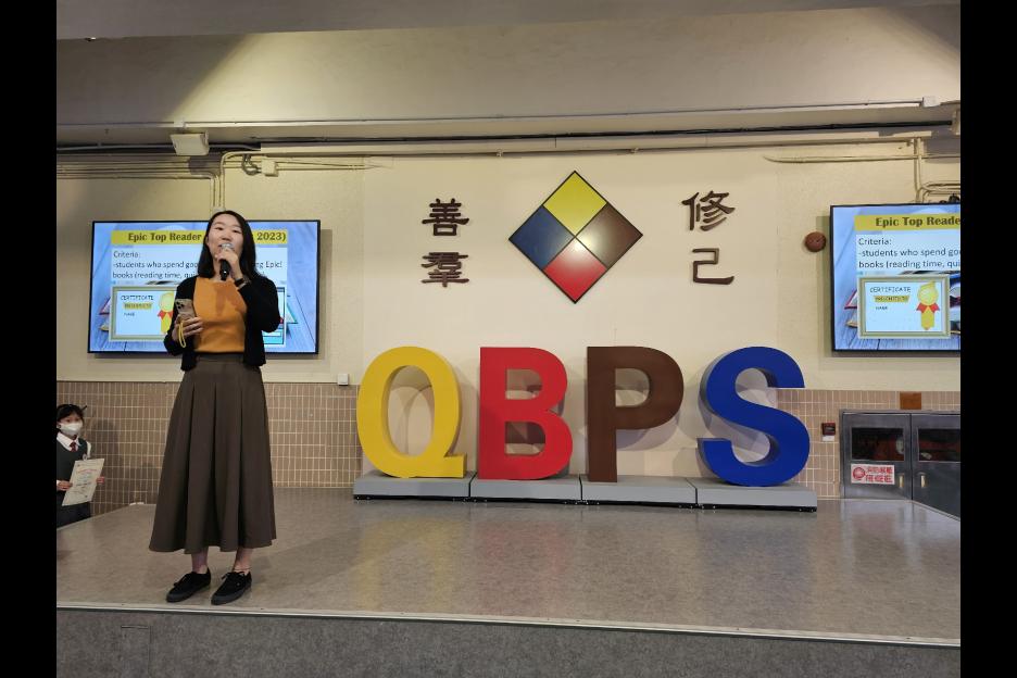 早會開始是由英文科的「EPIC TOP READER」分享和獎項頒發,然後是圖書館舉辦的校外推廣閱讀活動和校內老師分享網上圖書。學生們的精美圍裙比賽也是圖書館舉辦的活動,那麼多的活動都是希望同學能養成閱讀的習慣。最後,是科技科的頒獎環節。
