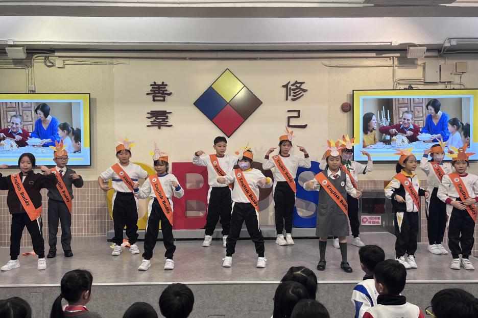 今天是英文早會。今天有English buddies為我們介紹西方節日——感恩節,還送上可愛的舞蹈演出。接著恭喜足球隊代表獲得由伯特利中學舉辦的「小學四人足球比賽」亞軍。最後是校園電視台的短片拍攝比賽的頒獎,恭喜獲獎同學。