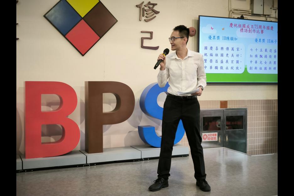 今天是普通話早會,先由小小演説家為我們分享有關勤學的主題。接著頒發「慶祝祖國成立75周年國慶標語創作比賽」的獎項,恭喜得獎的同學。
