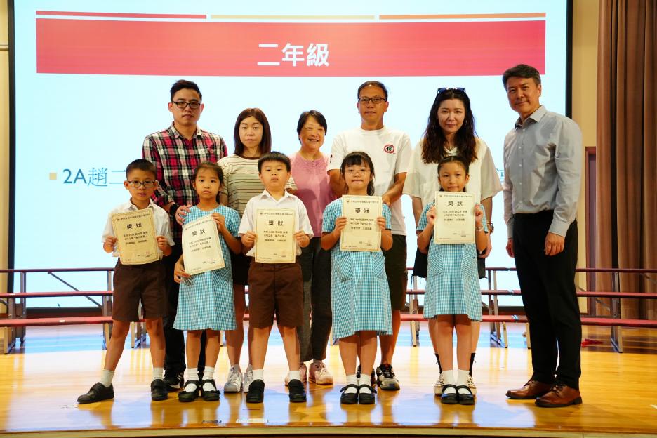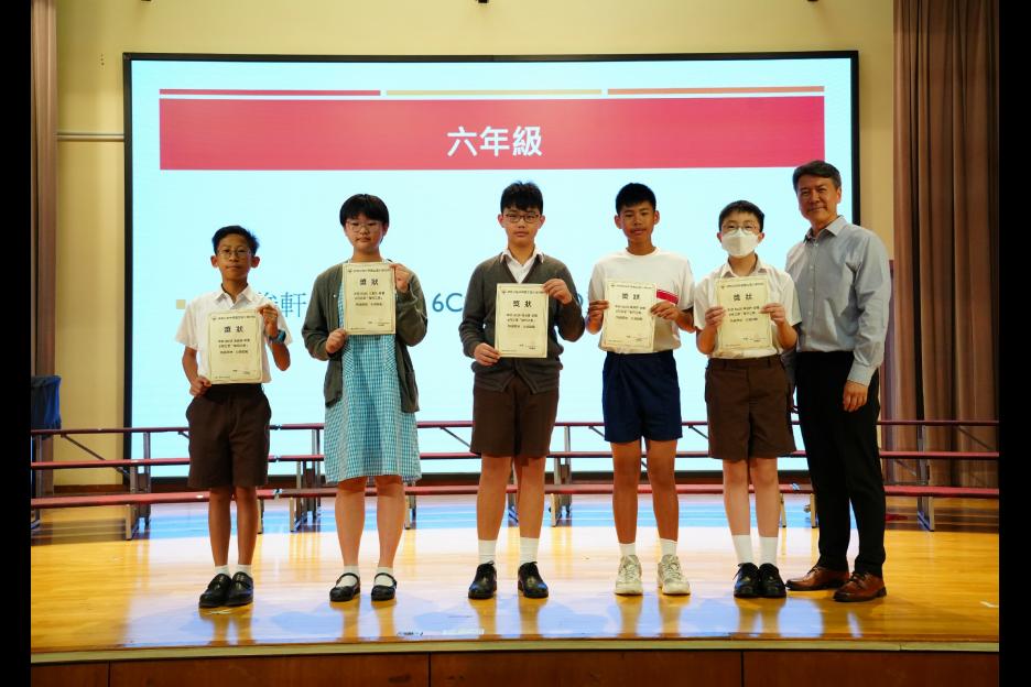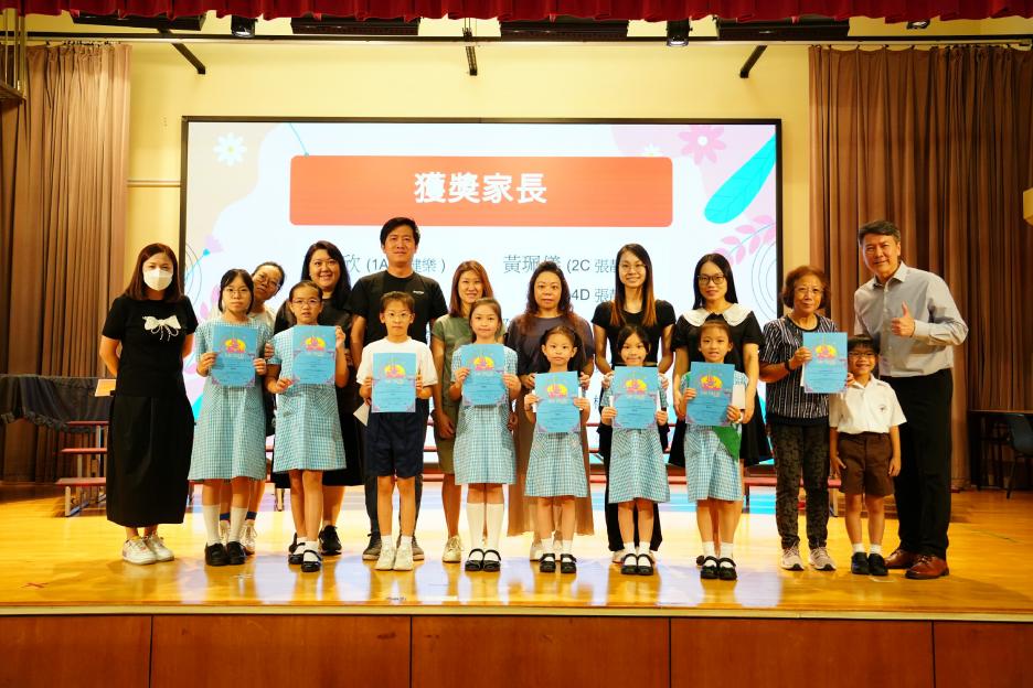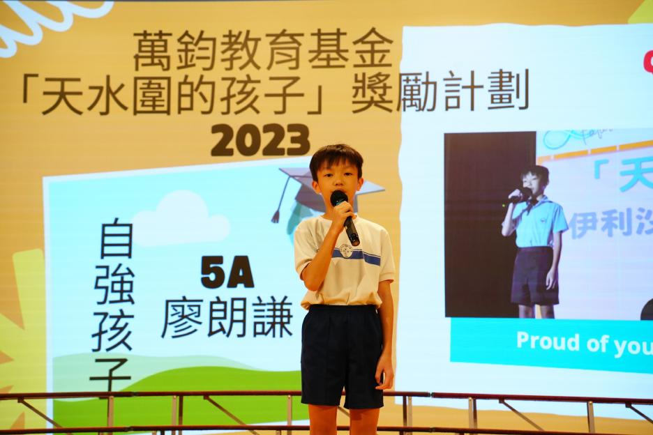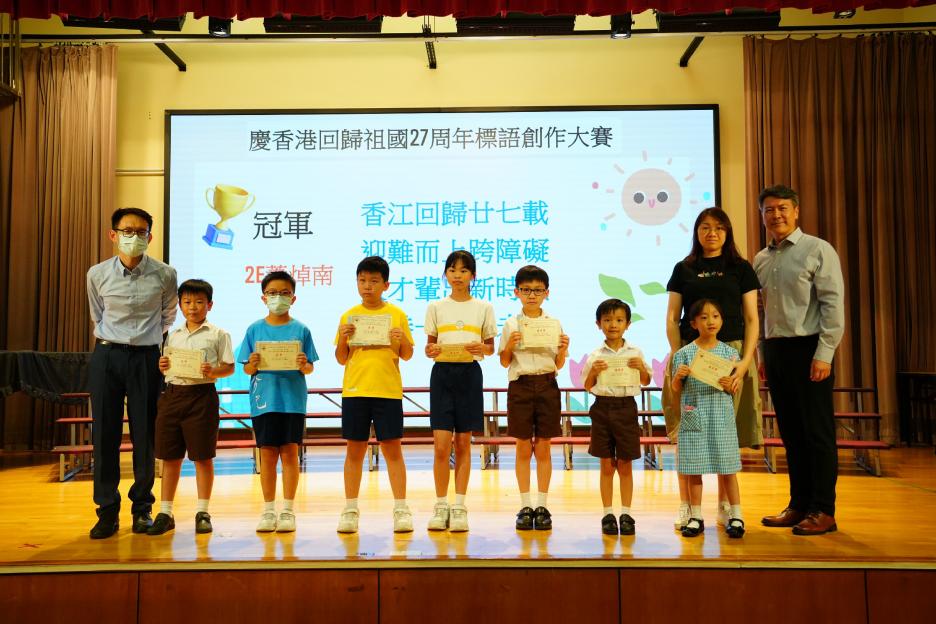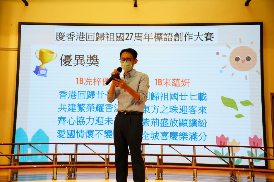 本年度最後一個早會,剛巧亦是六年級放榜的大日子,所以今天的早會在禮堂頒獎和課室進行直播。首先分享的喜悅是足球隊在友校的比賽中奪冠,然後是家校組「伴你高飛」的獎項頒發,而對象正正是非常支持學校的家長。接着是「每月之星」、「回歸標語創作比賽」和視藝科比賽的頒獎。最後是「天水圍的孩子」得獎學生向大家分享得獎感受並如何成為「自強孩子」的經歷。