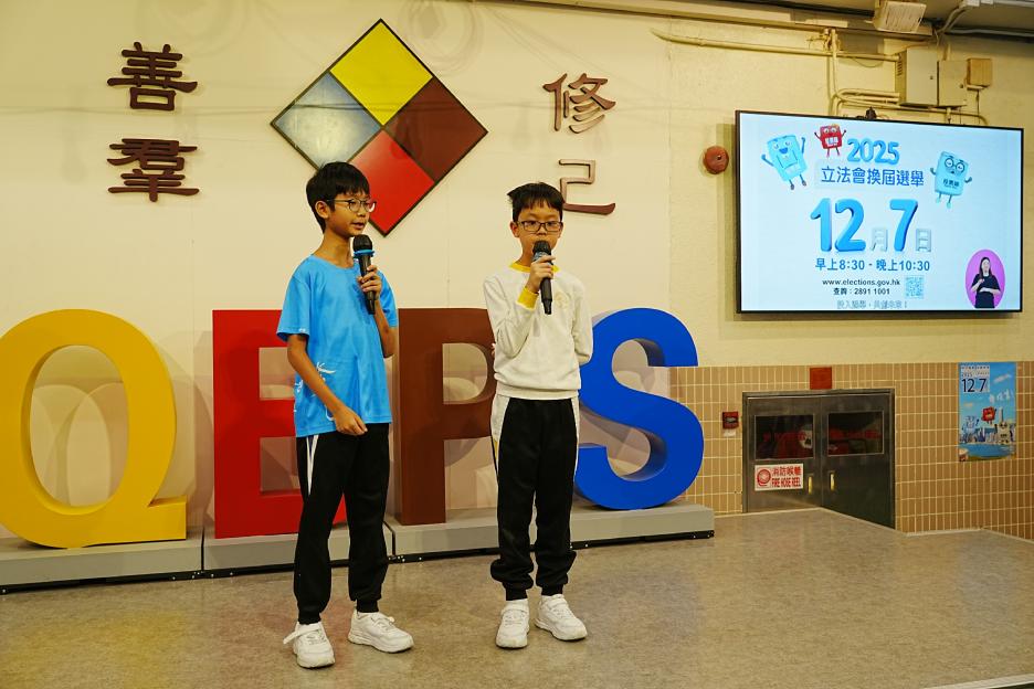 今天是普通話早會。首先,我校六年級數學特工隊一共十二位同學在11月15日參加由伯特利中學舉辦的第十七屆數學多元挑戰賽,我們在團體比賽中,一共奪得一個一等獎和兩個二等獎。接著,領袖生總隊長表揚及提醒全校同學最近的行為表現。別忘了,2025立法會換屆選舉將於12月7日(日)進行投票,本校《憲法》和《基本法》 學生校園大使於早會鼓勵各位同學積極參與相關的填色比賽,並回家呼籲家長於當天踴躍投票。最後,是「Marty 比賽投票」宣傳。