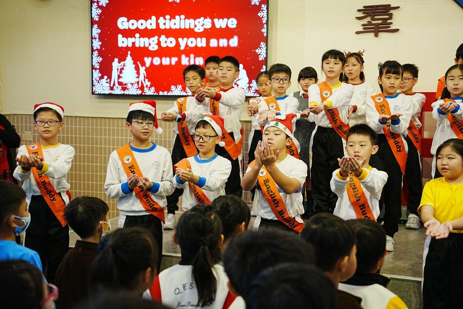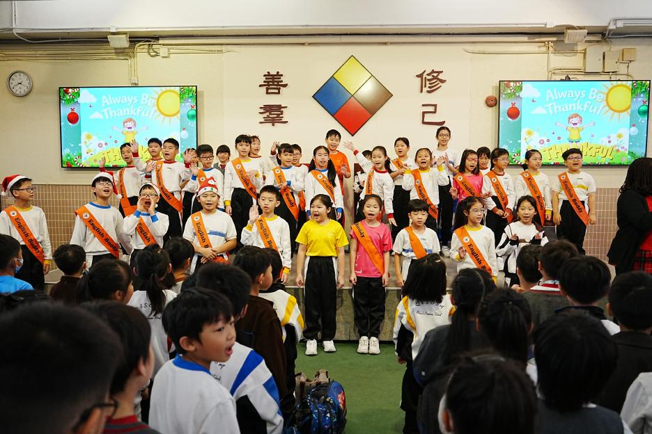今天是英文早會。首先由English Buddies為我們帶來一系列聖誕歌曲,預祝大家聖誕節快樂!接著是班際借閱比賽頒獎,各班同學都努力借閱圖書,只要多借書、多閱讀,就能為班爭光,共享榮譽與獎品!另外,「25-26悦讀千里號獎勵計劃」計劃已啟航,同學一起讀,一起獎,探索書海無邊界。最後是魔力橋數學棋小學邀請賽初賽頒獎。