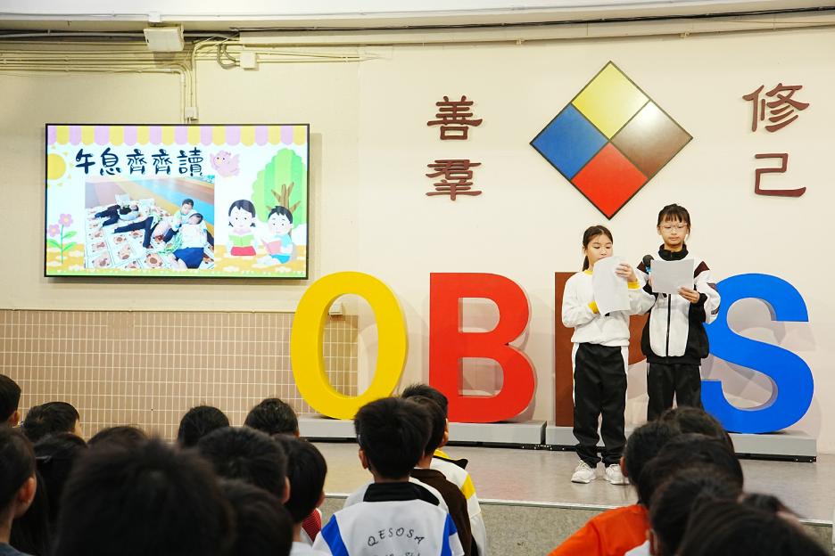 今天是英文早會,也是新年假期後的第一個早會。先祝大家新年快樂!身體健康!首先有英文科SPELLING BEE COMPETITION,獲獎同學分別來自二、三年級,他們在英文串字方面有出色的表演。接著是12-1月班際借書比賽頒獎,各班同學都努力借閱圖書,只要多借書、多閱讀,就能為班爭光,共享榮譽與獎品!午息齊齊讀活動開展了!放鬆的午息時間,大家可以到彩二一起輕鬆讀書。慢慢看、用心讀,快樂學知識,度過美好午息。最後是兩項頒獎,我校學生在2026全港幼稚園及小學積木機械人編程挑戰賽中得到金獎,以及在2026 「星輝盃」競技體操邀請賽取得佳績。